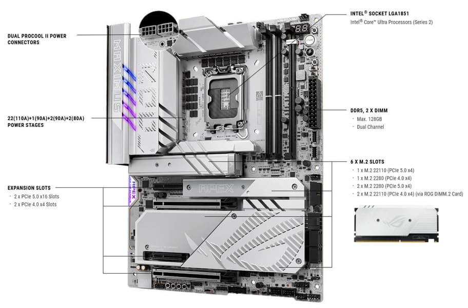 Asus ROG Maximus Z890 Apex поддерживает процессоры Intel Core Ultra 2xx, выполненные под разъем (сокет) LGA1851.