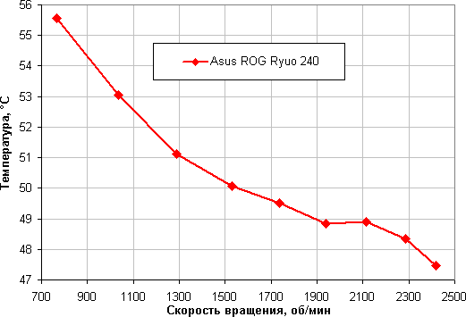Зависимость температуры процессора AMD Ryzen Threadripper 1920X при его полной загрузке от скорости вращения вентиляторов: