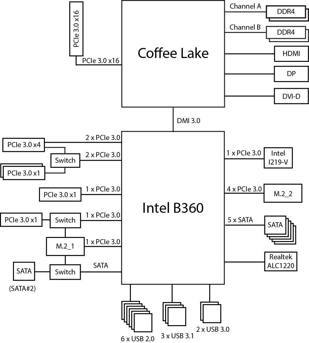 Мы уже писали об особенностях чипсета Intel B360 и сравнивали его с остальными чипсетами Intel 300-й серии, так что повторятся не будем. Напомним лишь, что чипсет Intel B360 имеет 24 HSIO-порта. При этом 12 портов PCIe 3.0, до 6 портов SATA, до 4 портов USB 3.1 и до шести портов USB 3.0, но так, чтобы общее количество портов USB 3.1 и USB 3.0 не превосходило шести.