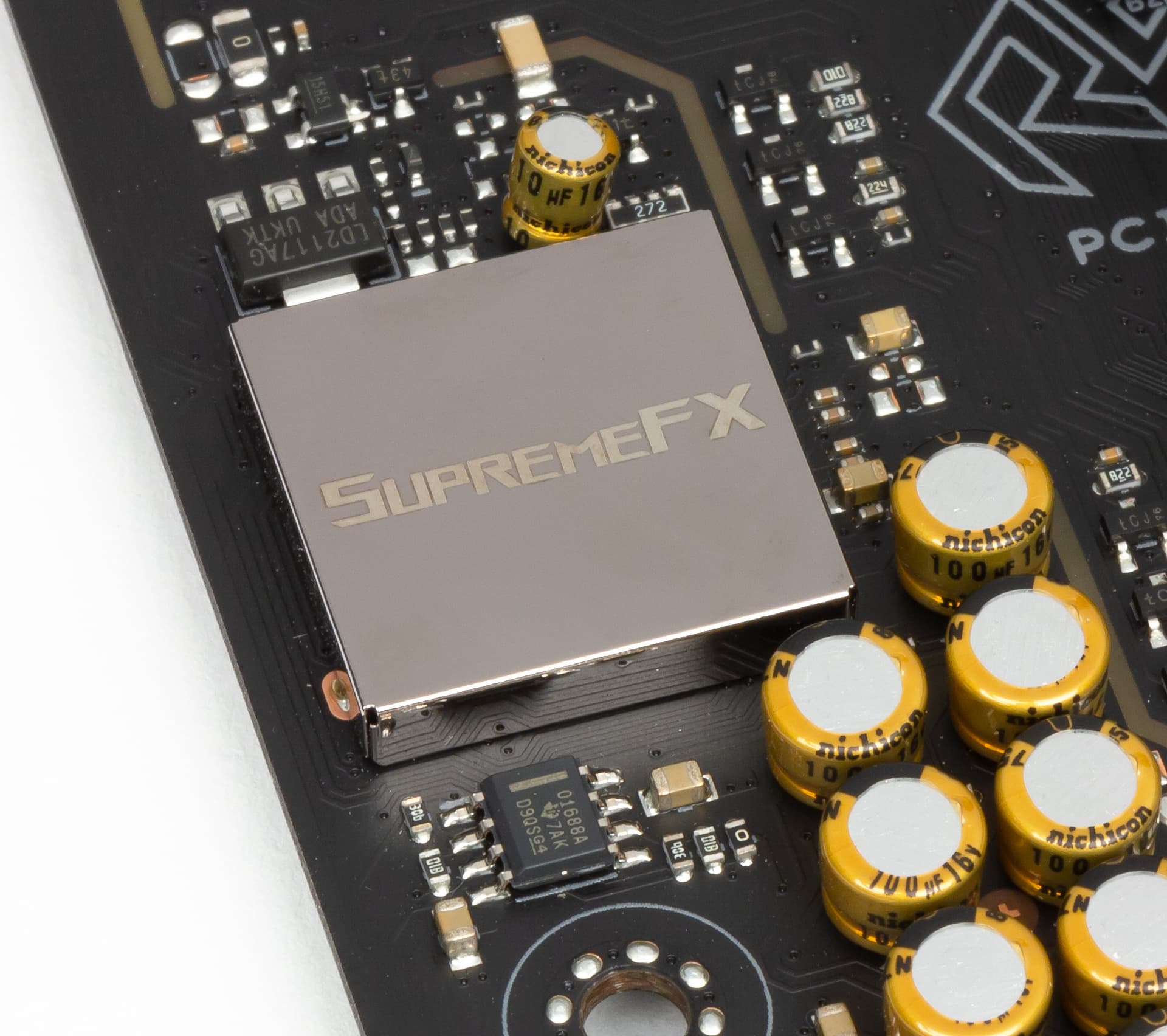Аудиоподсистема платы Asus ROG Strix B360-F Gaming основана на кодеке Realtek ALC1120, изолирована на уровне слоев PCB от прочих компонентов платы и выделена в отдельную зону.