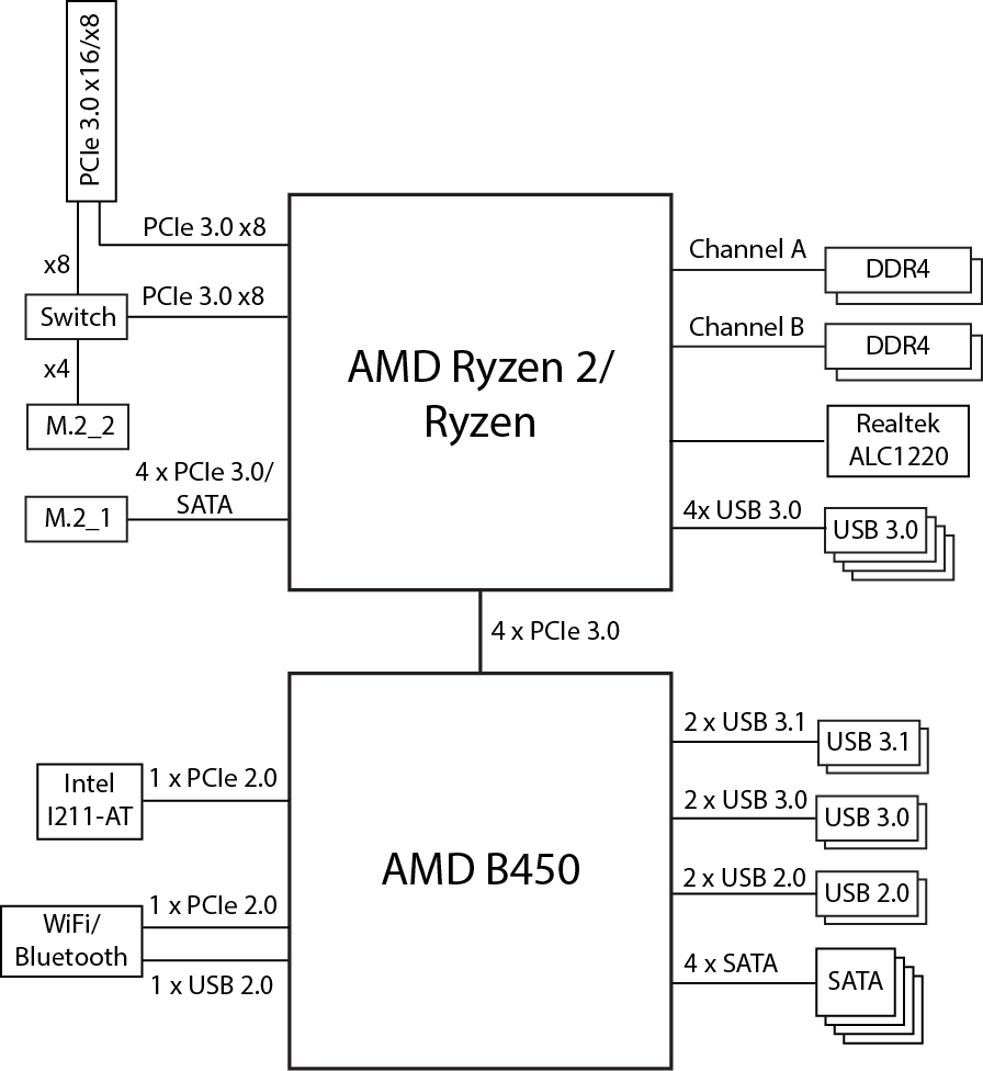 Чипсет B450 обеспечивает 6 портов PCIe 2.0, 4 порта SATA 6 Гбит/с, а также 2 порта USB 3.1, 2 порта USB 3.0 и 6 портов USB 2.0. Кроме того, чипсет поддерживает возможность создания одного разъема SATA Express. Сама по себе поддержка этого разъема малоактуальна, поскольку этот стандарт оказался невостребованным и де-факто умер. Однако для такого разъема используется два порта SATA и два порта PCIe 3.0, то есть это дает еще две линии PCIe 3.0, реализованные через чипсет.