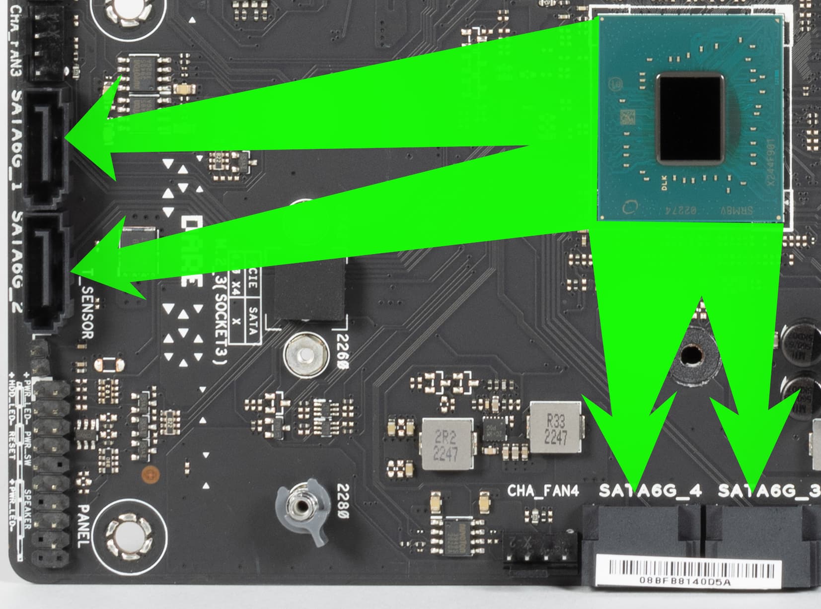 Порты SATA реализованы через чипсет B760 и поддерживают создание RAID. Размещены по-парно вдоль разных сторон платы.