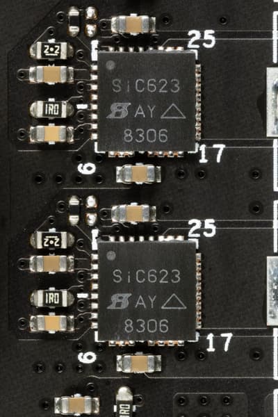 Каждый канал фазы имеет суперферритовый дроссель и DrMOS SiC623 (60A) от Vishay для VCore и встроенного графического ядра.