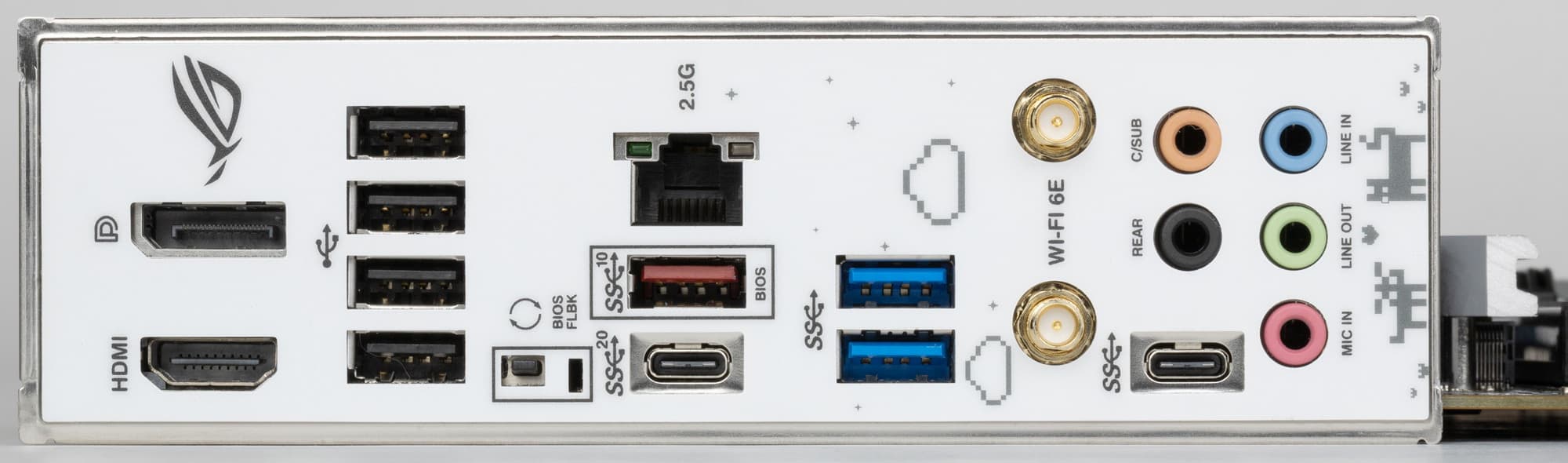 | Разъемы на задней панели | 1 × USB 3.2 Gen2x2 (Type-C) 1 × USB 3.2 Gen2 (Type-С) 1 × USB 3.2 Gen2 (Type-A) 2 × USB 3.2 Gen1 (Type-A) 4 × USB 2.0 (Type-A) 1 × RJ-45 5 аудиоразъемов типа миниджек 2 антенных разъема 1 разъем HDMI out 1 разъем Display Port out кнопка перепрошивки BIOS — Flashback |