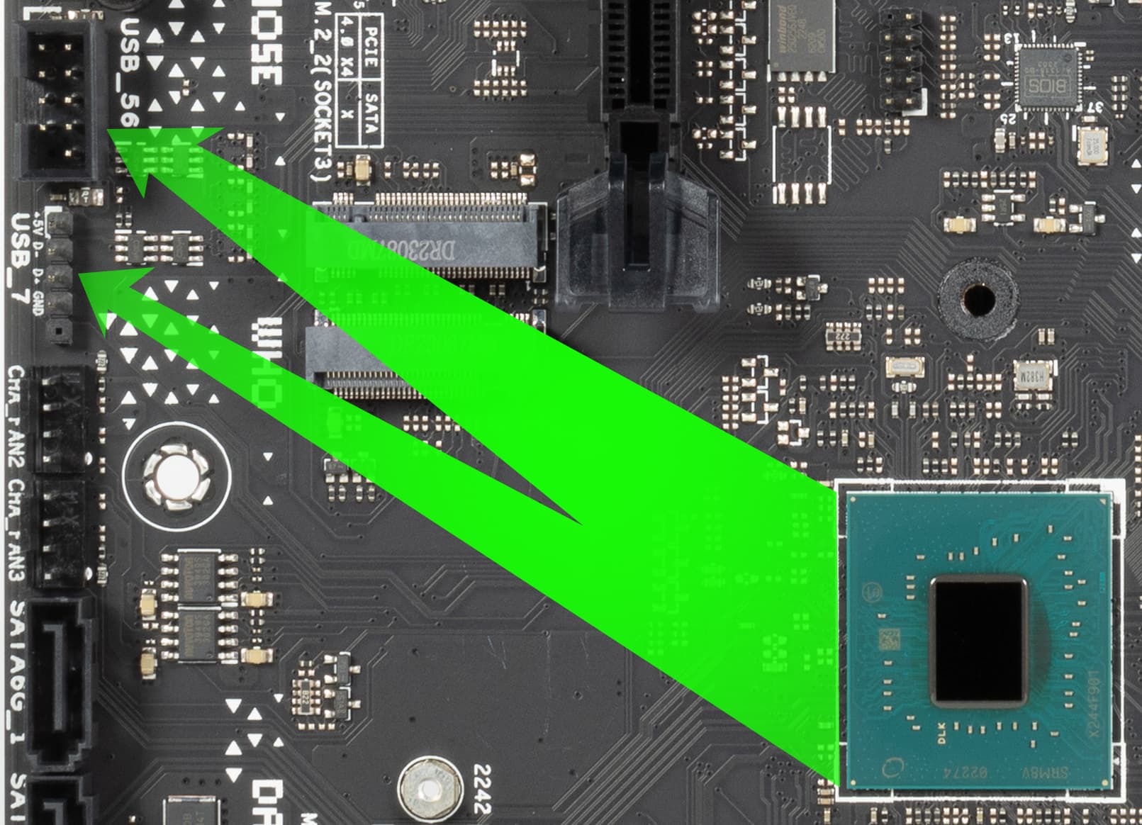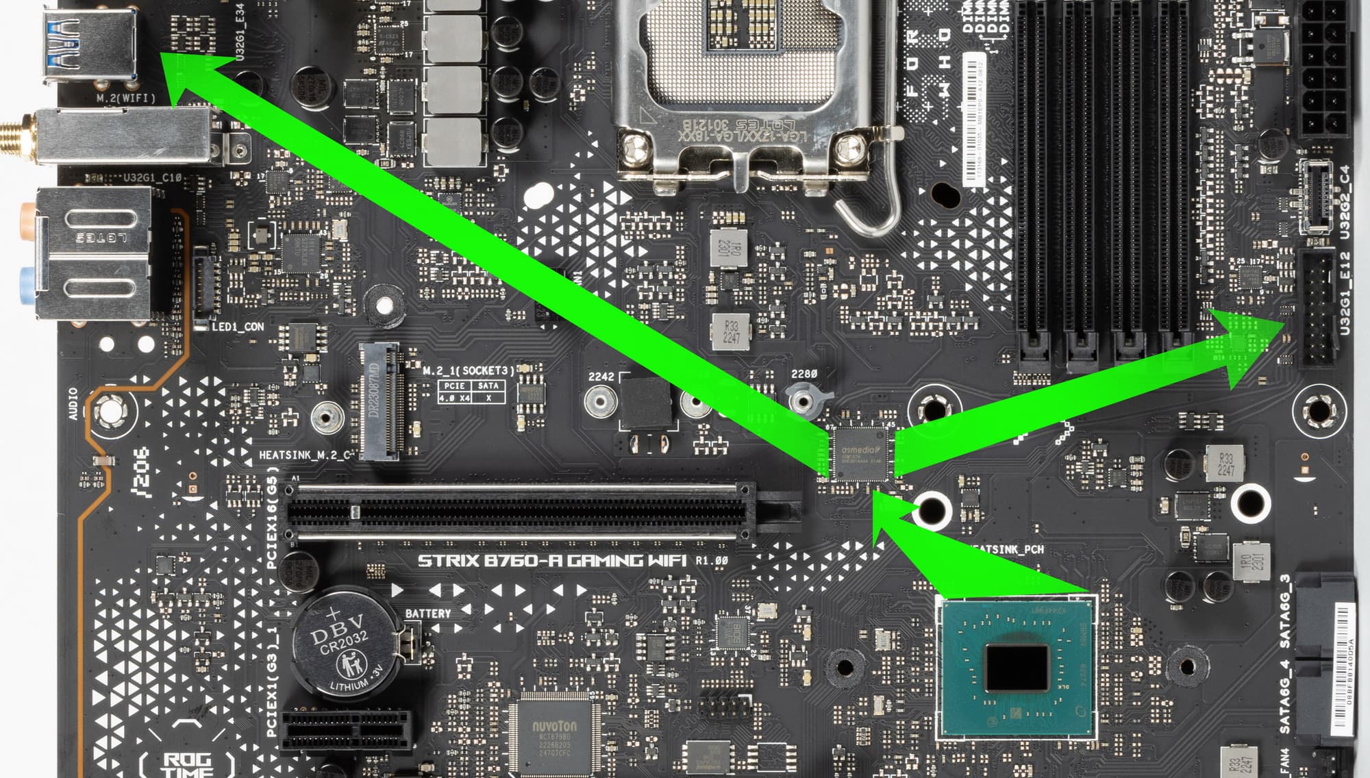Повторим: чипсет B760 способен реализовать не более 12 портов USB, из которых может быть до 6 портов USB 3.2 Gen1, до 4 портов USB 3.2 Gen2, до 2 портов USB 3.2 Gen2x2, и/или до 12 портов USB 2.0.