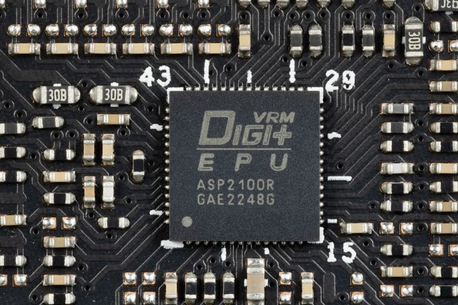 Управляет схемой питания VCore и iGPU фирменный ШИМ-контроллер Digi+ ASP2100.