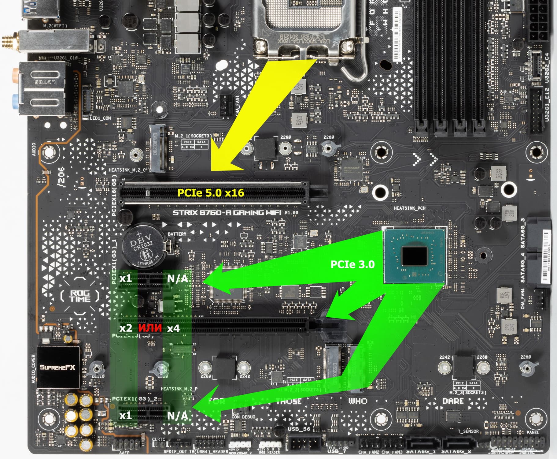 Кроме USB-портов, к которым мы подойдем позже, чипсет B760 обладает 14 PCIe линиями и 4 портами SATA. Считаем, сколько линий уходит на поддержку (связь) с тем или иным элементом (надо учитывать, что 14 линий не единой версии, а 10 линий PCIe 4.0 и 4 линии PCIe 3.0):