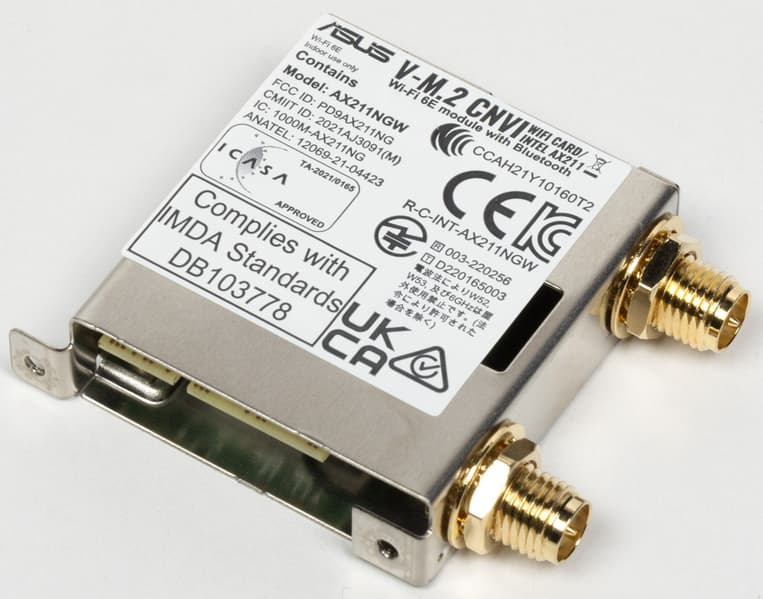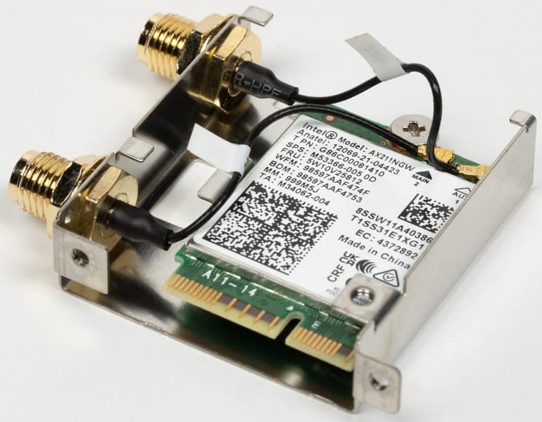 Имеется и комплексный беспроводной адаптер на контроллере Intel AX-211NGW, через который реализованы Wi-Fi 6E (802.11a/b/g/n/ac/ax) и Bluetooth 5.3. Он установлен в слот M.2 (E-key), и его разъемы для привинчивания выносных антенн выведены на заднюю панель.