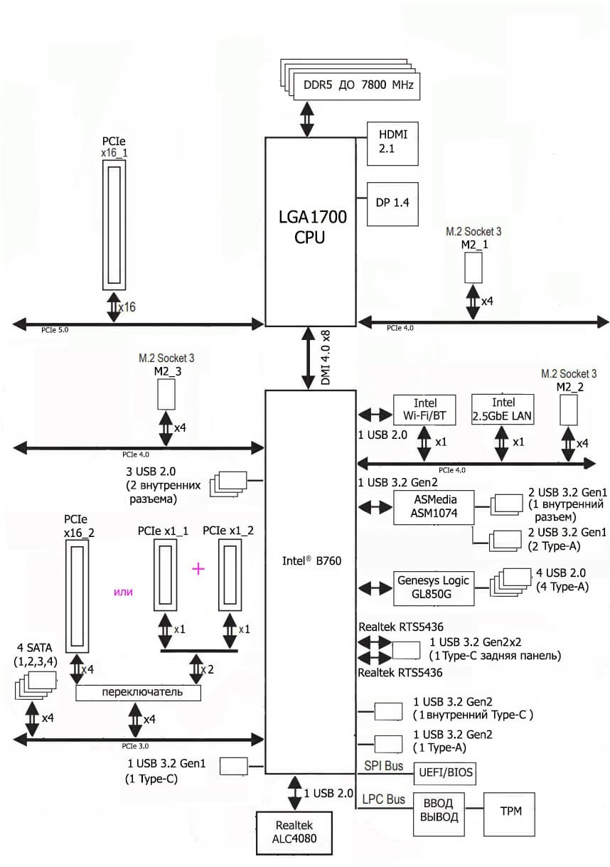 Процессоры Intel Core 12/13/14-го поколений (совместимые с сокетом LGA1700 и поддерживаемые B760) имеют 20 линий ввода-вывода (16 PCIe 5.0, 4 PCIe 4.0), не имеют USB и SATA портов. При этом взаимодействие с B760 идет по особому каналу Digital Media Interface 4.0 (DMI 4.0 x4 (именно х4!)). Все PCIe линии процессора идут на слоты расширения PCIe и порт М.2. Serial Peripheral Interface (SPI) используется для взаимодействия с системой UEFI/BIOS, а шина Low Pin Count (LPC) — для связи с устройствами ввода/вывода, не требующими высокой пропускной способности (контроллерами вентиляторов, TPM, старой периферии).