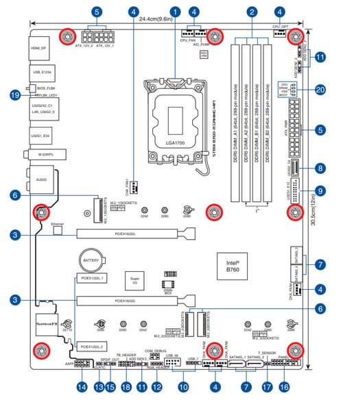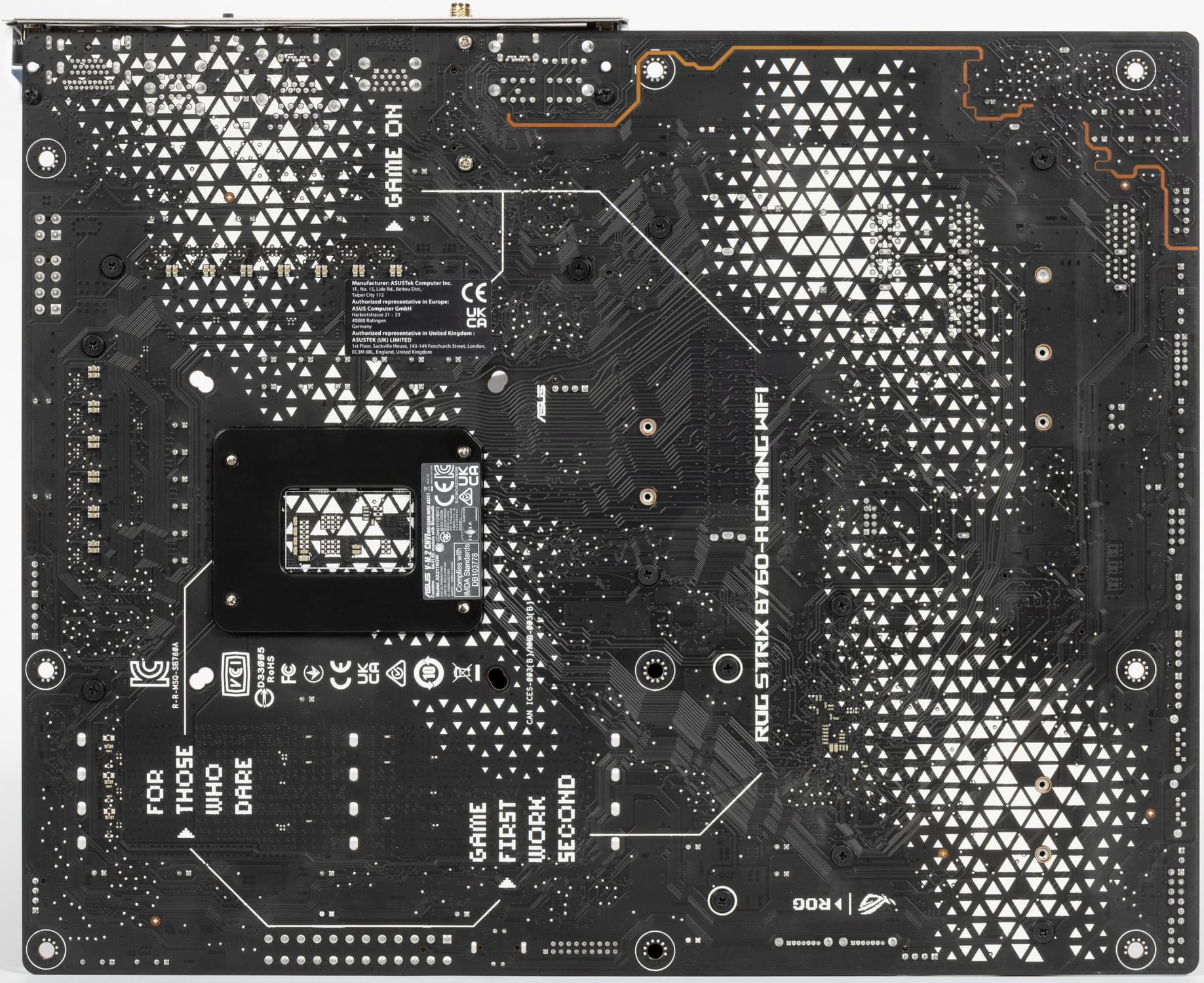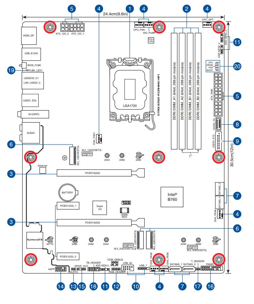 Форм-фактор Mini-ITX имеет размеры 170x170 мм, Micro-ATX до 244×244 мм, ATX до 305×244 мм, а E-ATX — до 305×330 мм. Материнская плата Asus ROG Strix B760-A Gaming WiFi выполнена в форм-факторе ATX, имеет размеры 305×244 мм, и на ней имеются 9 монтажных отверстий для установки в корпус.