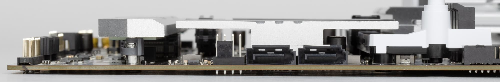 Все слоты М.2 оснащены радиаторами, при этом у M.2_1 – свой отдельный радиатор, а слоты М.2_2 и М.2_3 имеют общий радиатор. При этом системный чипсет охлаждается собственным радиатором, не объединенным с охлаждением для М.2 слотов.