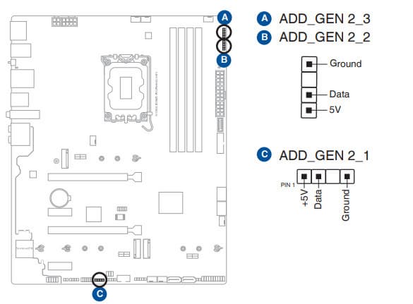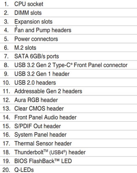 | Прочие внутренние элементы | 24-контактный разъем питания ATX 1 8-контактный разъем питания EPS12V 1 4-контактный разъем питания EPS12V 1 слот M.2 (E-key), занят адаптером беспроводных сетей 1 разъем для подключения порта USB 3.2 Gen2 Type-C 1 разъем для подключения 2 портов USB 3.2 Gen1 2 разъема для подключения 3 портов USB 2.0 7 разъемов для подключения 4-контактных вентиляторов и помп ЖСО 4 разъема для подключения адаптеров подсветки (1 разъем неадресуемой RGB-ленты, 3 разъема адресуемой ARGB-ленты) 2 разъема для подключения адаптера управления с передней панели корпуса 1 разъем для внешнего термодатчика 1 разъем для подключения дискретного Thunderbolt |