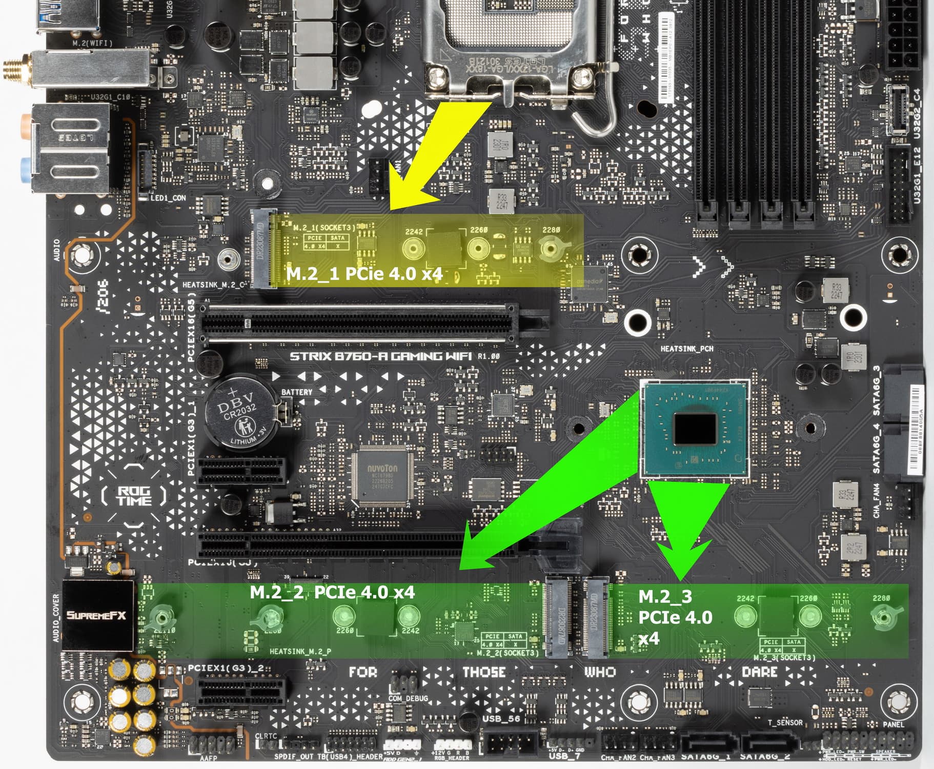 Второй M.2_2 и третий M.2_3 получают данные от чипсета B760. При этом M.2_2 поддерживает размеры модулей 2242/2260/2280/22110.