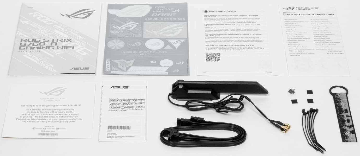 Asus ROG Strix B760-A Gaming WiFi поставляется в стандартной коробке фирменного дизайна серии ROG (однако в серых тонах, что подчеркивает серебристый дизайн радиаторов у платы). Комплект размещен под платой в отдельном отсеке.