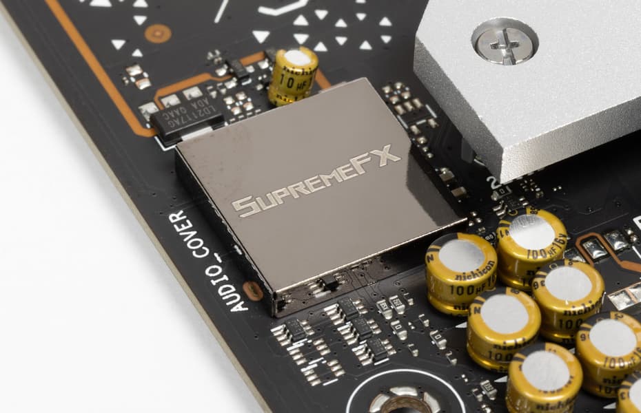 В данной плате звуком заведует современный аудиокодек от Realtek ALC4080. Он обеспечивает вывод звука по схемам до 7.1 с разрешением до 32 бит / 384 кГц. В стиле Asus – закрывать аудиокодек фирменным колпачком SupremeFX.