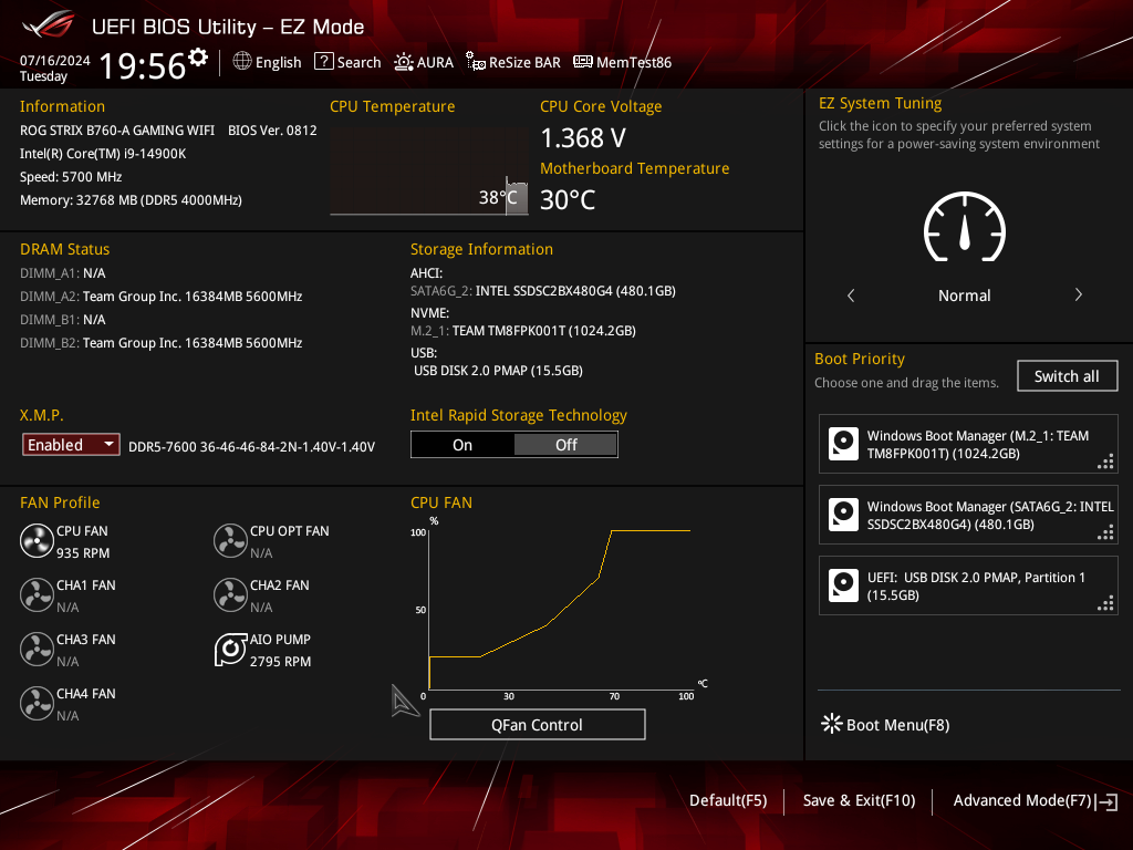 Формально имеется поддержка памяти DDR5 до 4800 МГц, однако всем хорошо известно, и производители материнских плат это активно рекламируют: через XMP-профили сейчас можно использовать частоты до 8000 МГц. В частности данная плата поддерживает частоты до 7800 МГц.