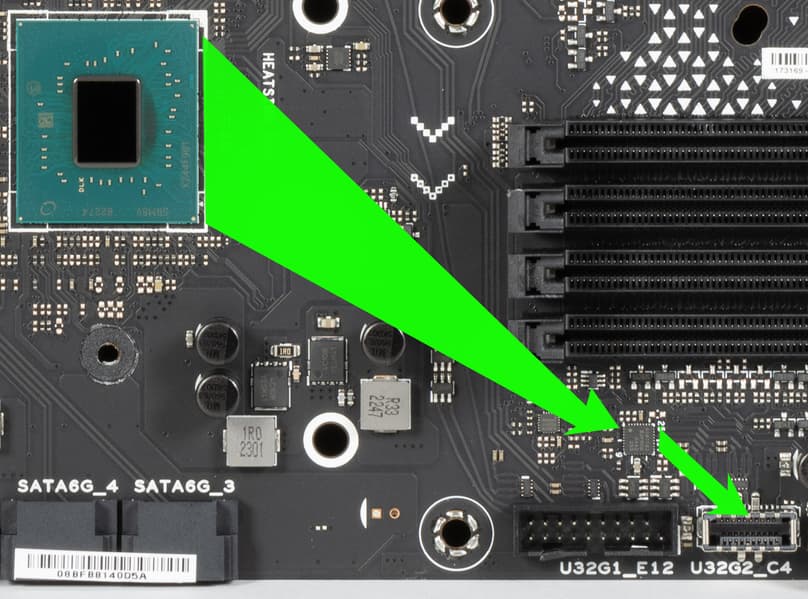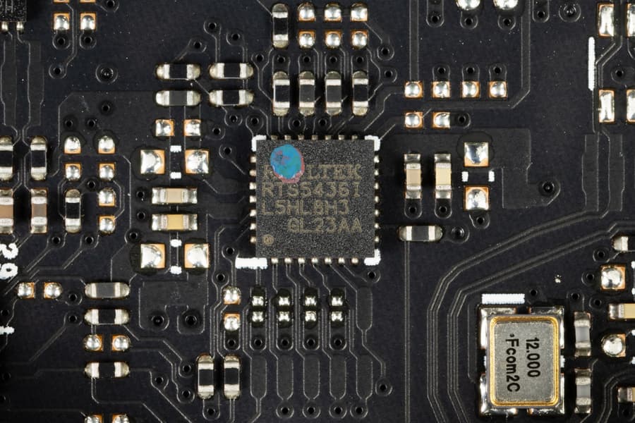 - 1 порт USB 3.2 Gen2x2: реализован с помощью двух линий USB 3.2 Gen2 от хаба Realtek RTS5463 (на него потрачена линия USB 3.2 Gen2 от B760) и представлен портом Type-C на задней панели;