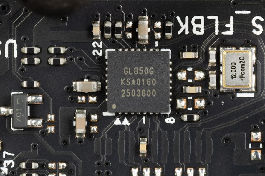 - 7 портов USB 2.0/1.1: 4 реализованы через хаб Genesys Logic GL850G (на него потрачена линия USB 2.0 от B760) и представлены на задней панели 4 портами Type-A (черного цвета); еще 3 реализованы через B760 представлены двумя внутренними разъемами на материнской плате: один на 2 порта, а другой на 1 порт.