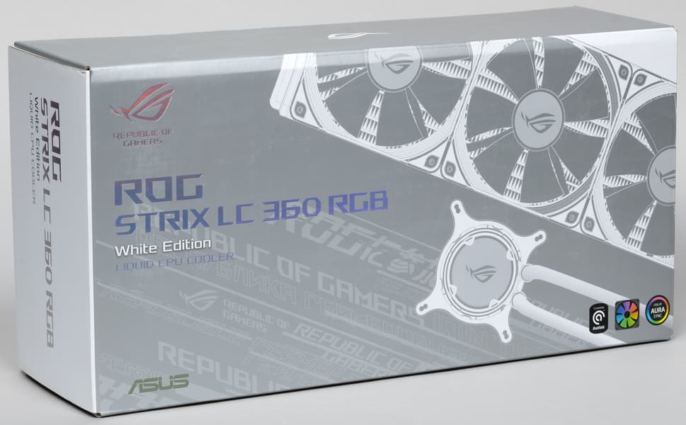 Поставляется система жидкостного охлаждения Asus ROG Strix LC 360 RGB White Edition в коробке из среднего по толщине гофрированного картона. На внешних плоскостях коробки есть частичные изображения самого продукта, а также перечислены основные особенности и технические характеристики. Часть изображений залакированы. Надписи преимущественно на английском, но некоторые из них продублированы на нескольких языках, включая русский. Для защиты и распределения деталей используются форма из папье-маше, прокладка из вспененного полиэтилена и пластиковые пакеты. Подошва теплосъемника и термопаста на ней защищены колпаком из прозрачного пластика.