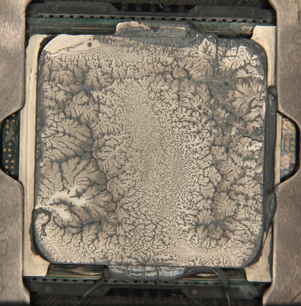 Запаса для ее восстановления в комплекте поставки, к сожалению, нет. В тестах использовалась качественная термопаста другого производителя. Забегая вперед, продемонстрируем распределение термопасты после завершения всех тестов. На процессоре Intel Core i9-7980XE:
