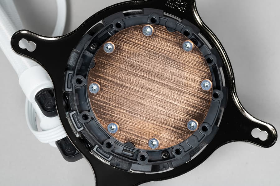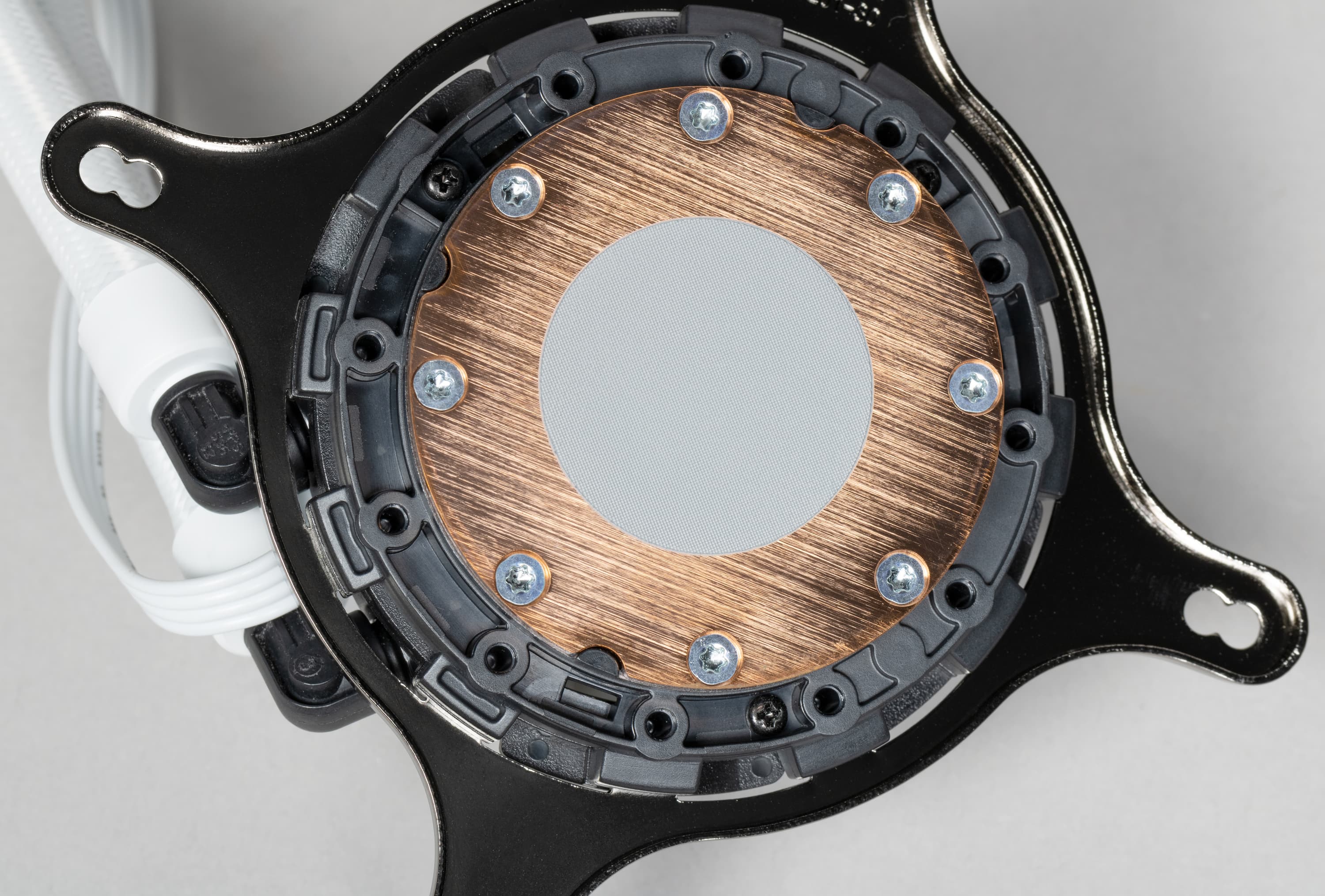 Диаметр этой пластины — 54 мм, а внутренняя часть, ограниченная отверстиями, имеет диаметр примерно 44 мм. Подошва практически идеально плоская. Ее центральную часть занимает нанесенная тонким слоем термопаста.