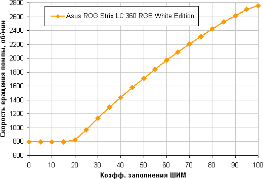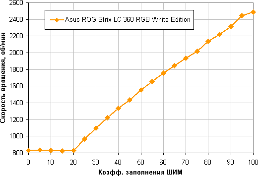 Хороший результат — монотонный рост скорости вращения при изменении коэффициента заполнения от 20% до 100%, диапазон регулировки скорости вращения широкий. При снижении коэффициента заполнения (КЗ) до 0% вентиляторы не останавливаются. Это может иметь значение, если пользователь хочет создать гибридную систему охлаждения, которая при низкой нагрузке работает полностью или частично в пассивном режиме.