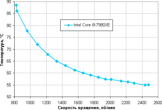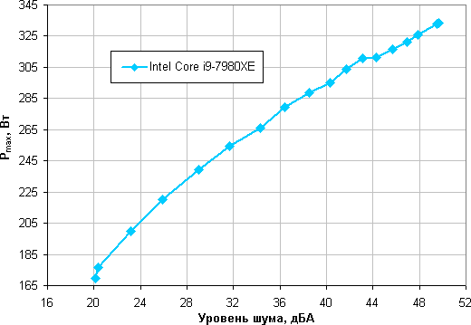 Приняв 25 дБА за критерий условной бесшумности, получим примерную максимальную мощность процессоров, соответствующих этому уровню. Это порядка 215 Вт для процессора Intel Core i9-7980XE. Если не обращать внимания на уровень шума, то пределы мощности можно увеличить где-то до 330 Вт. Еще раз уточним, это в жестких условиях обдува радиатора нагретым до 44 градусов воздухом, при снижении температуры воздуха указанные пределы мощности для бесшумной работы и максимальной мощности возрастают.
