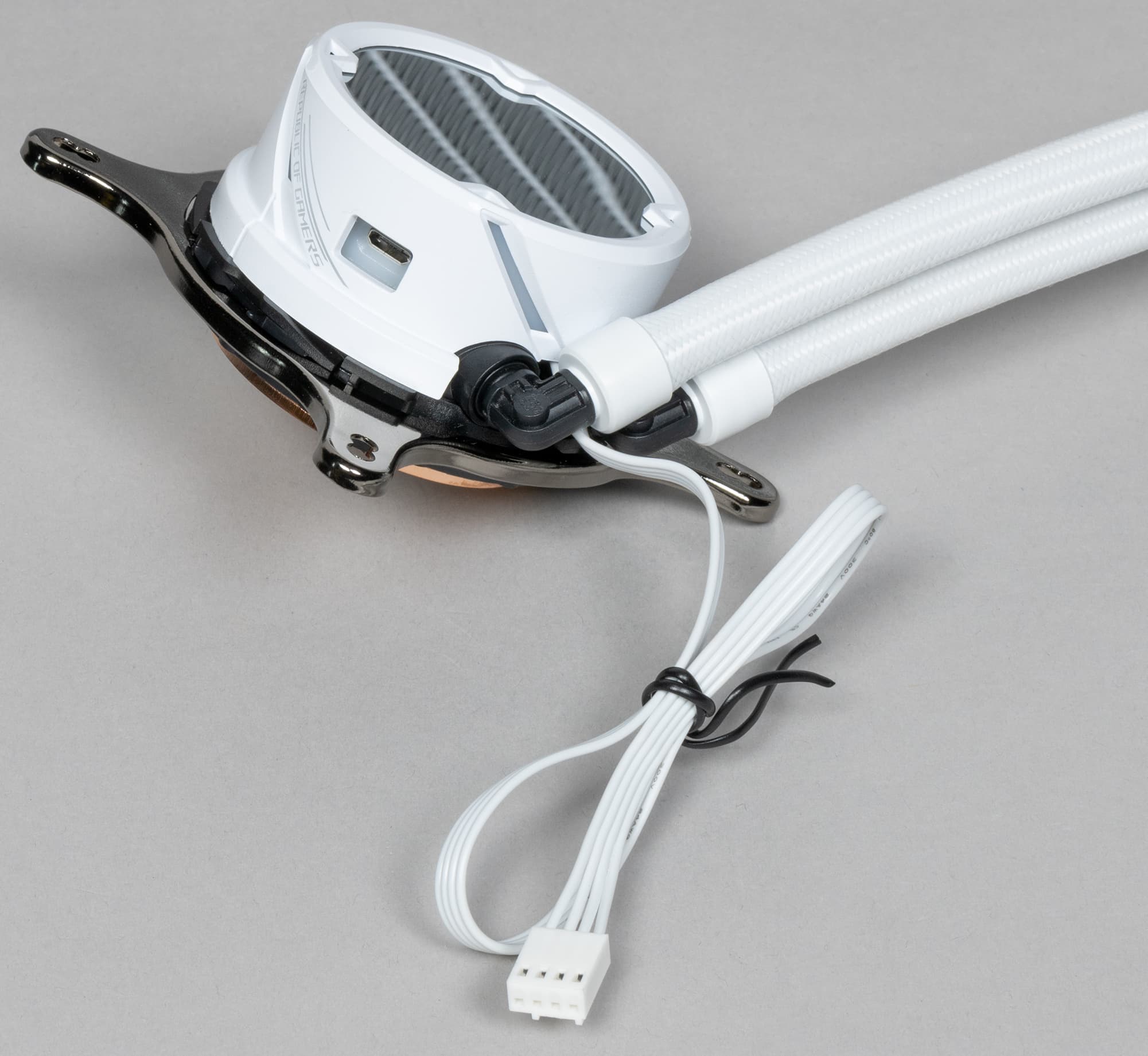 Кабель питания помпы оснащен четырехконтактным разъемом (общий, питание, датчик вращения и управление ШИМ) и имеет длину 32 см. Его предлагается вставить в трех-/четырехконтактный разъем для процессорного кулера или специальный разъем для помпы на мат. плате. Отметим, что управление вращением помпы с помощью ШИМ встречается редко. Отдельный USB-кабель длиной 85,5 см, подключаемый к помпе, соединяет ее с разъемом внутреннего USB на материнской плате. Управлять подсветкой помпы можно с помощью программы Armoury Crate. Просто при подаче питания по USB активен режим по умолчанию, как при этом подсвечивается помпа — можно посмотреть на видео ниже. Подсветка вентиляторов в данном случае подключена к стороннему контроллеру: