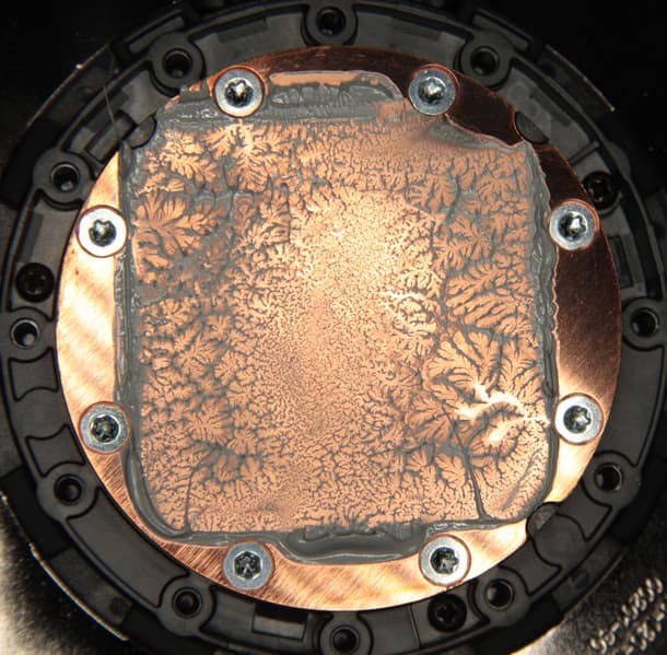 Видно, что термопаста распределилась тонким слоем практически на всю площадь крышки процессора, а ее избытки выдавились за края. Участок плотного контакта расположен примерно по центру и имеет большую площадь. Отметим, что крышка этого процессора сама по себе чуть выпуклая к центру. (Распределение термопасты, конечно, немного изменилось при разъединении процессора и помпы.)
