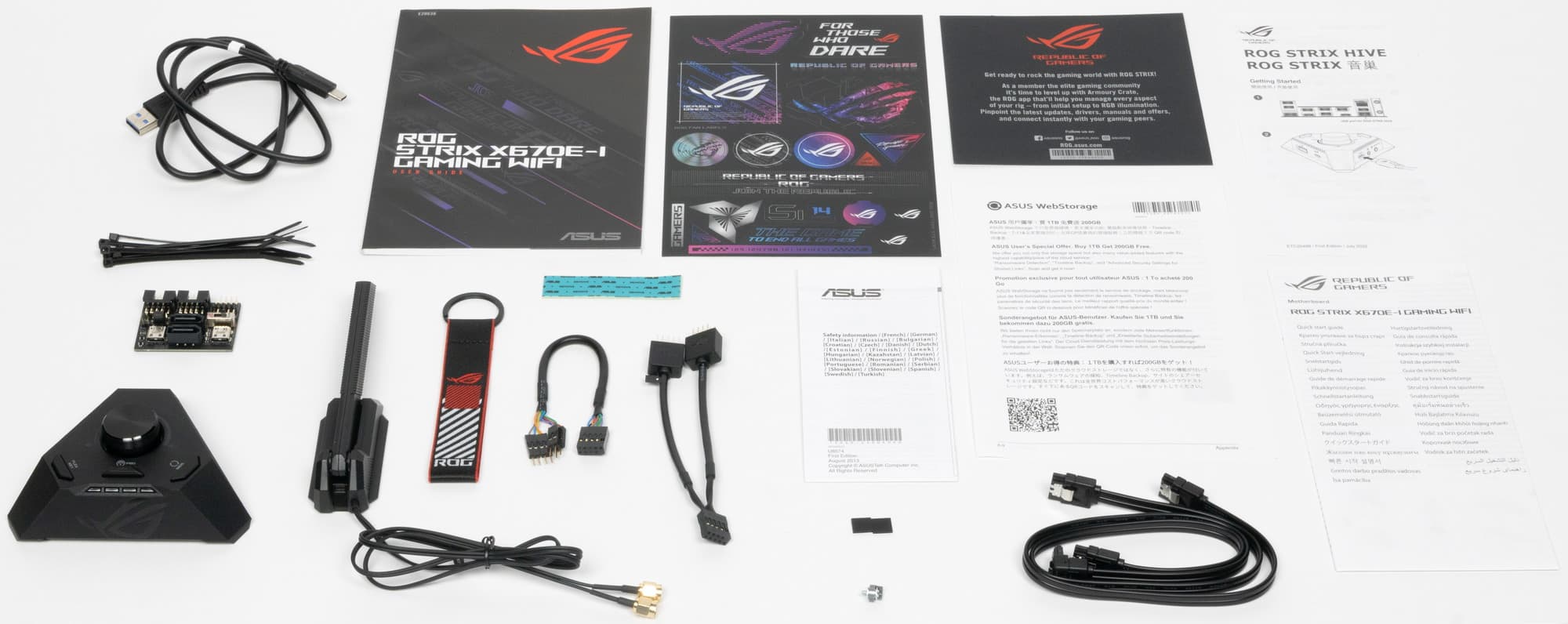 Комплект поставки соответствует флагманскому продукту: кроме традиционных элементов типа руководства пользователя и кабелей SATA, имеются антенна встроенного Wi-Fi-модуля, запасная полоска термопрокладки для М.2 слотов, разветвители для подключения портов USB, бонусные стикеры, брелок (может играть роль как, собственно, брелка, так и стяжки на «липучке»), внешний модуль интерфейсов ROG Strix Hive, кабель для его подключения, вспомогательная плата ROG FPS-II и стяжки.