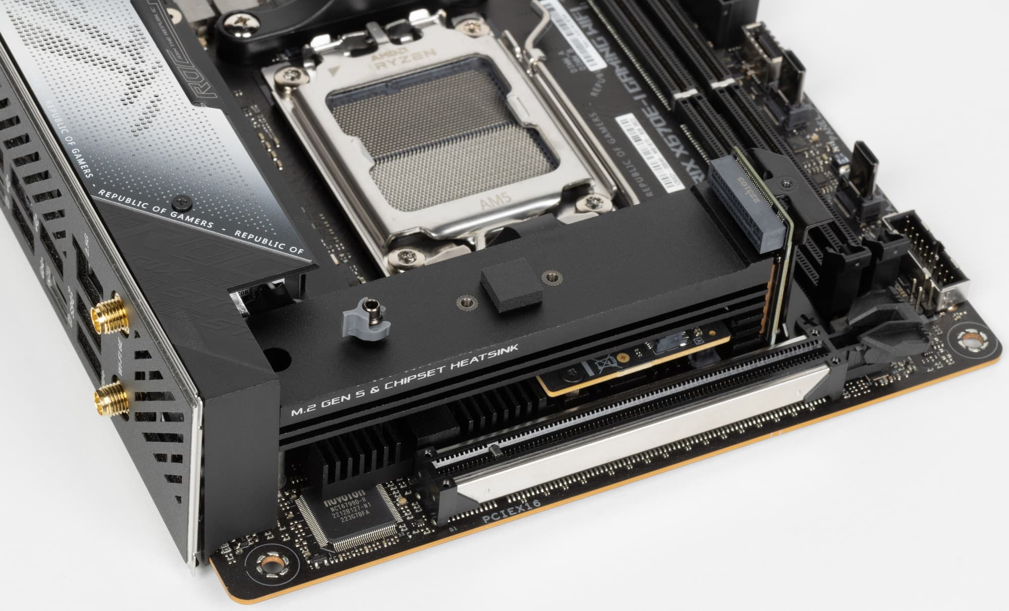 Для того, чтобы разместить на такой маленькой плате сложный чипсет X670E, состоящий из двух микросхем, инженерам Asus пришлось создавать целую «этажерку» из портов, и в одну из опор которой и был вписан элемент X670E (ну по сути это чипсет B650E).