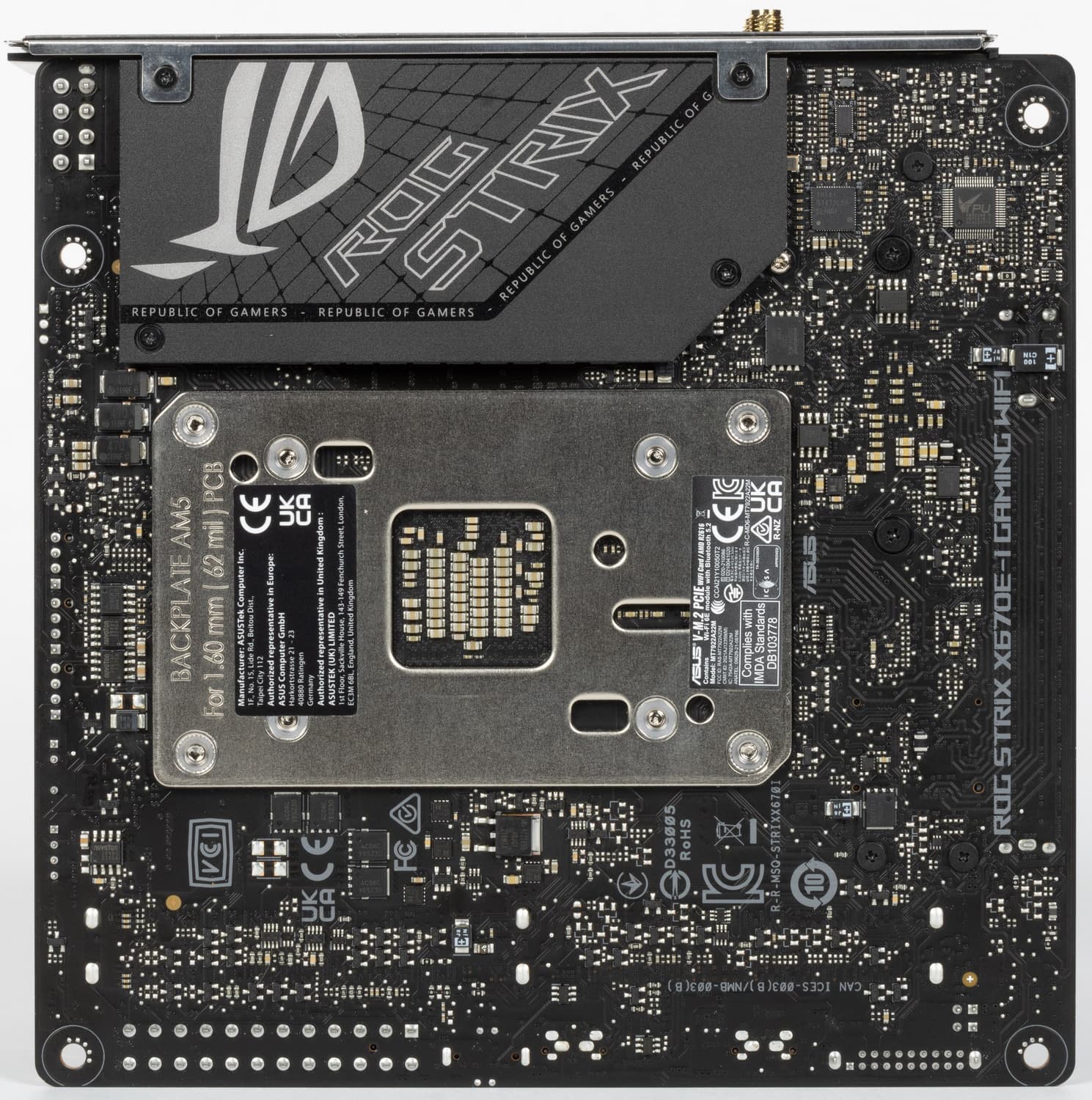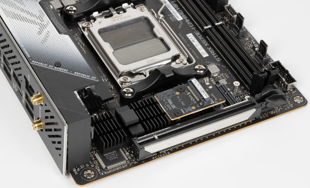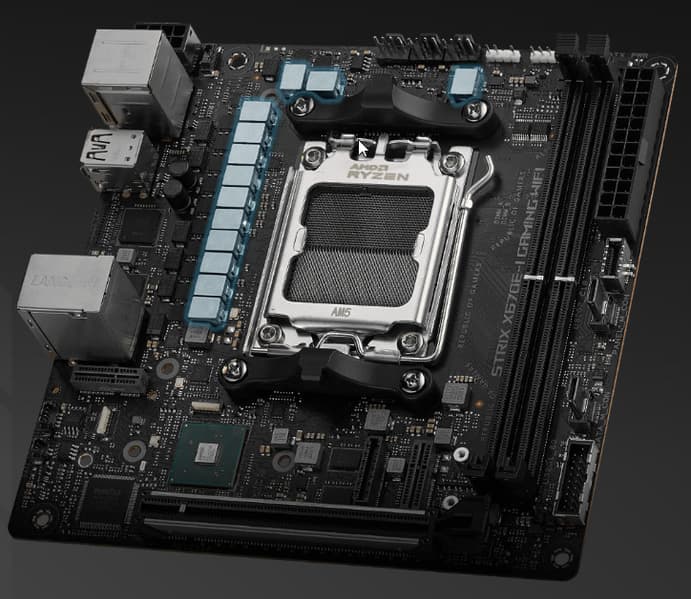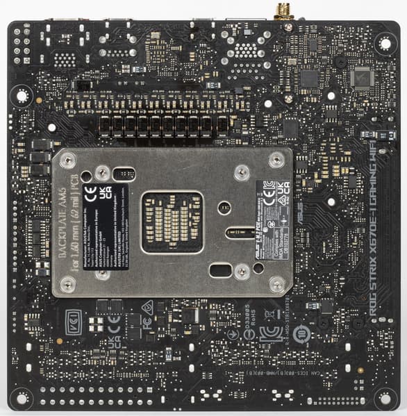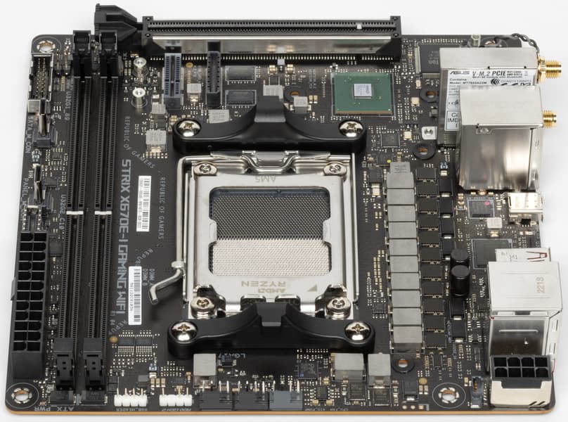 Форм-фактор Mini-ITX имеет размеры 170x170 мм, Micro-ATX до 244×244 мм, ATX до 305×244 мм, а E-ATX — до 305×330 мм. Материнская плата Asus ROG Strix X670E-I Gaming WiFi имеет размеры 170×170 мм, поэтому выполнена в форм-факторе Mini-ITX, и на ней имеются 4 монтажных отверстия для установки в корпус.