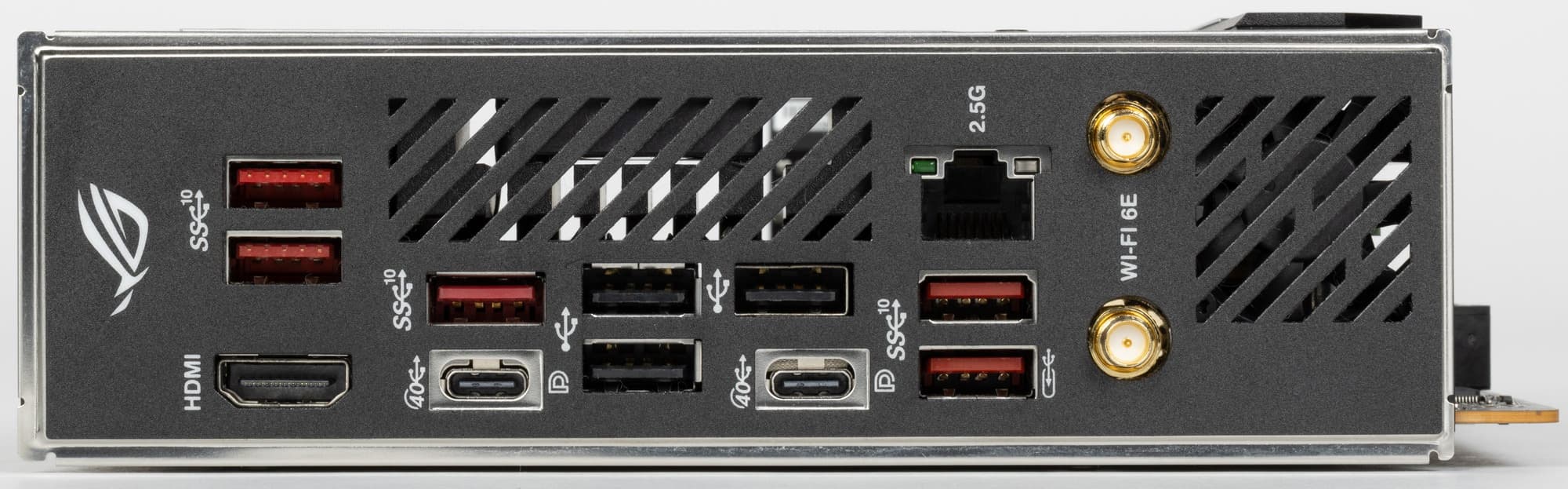 - 7 портов USB 3.2 Gen2: все реализованы через X670E и 5 представлены на задней панели портами Type-A (красного цвета); один представлен внутренним портом Type-C (для подключения к соответствующему разъему на передней панели корпуса); и последний представлен на внешнем блоке Asus ROG Hive портом Type-C;