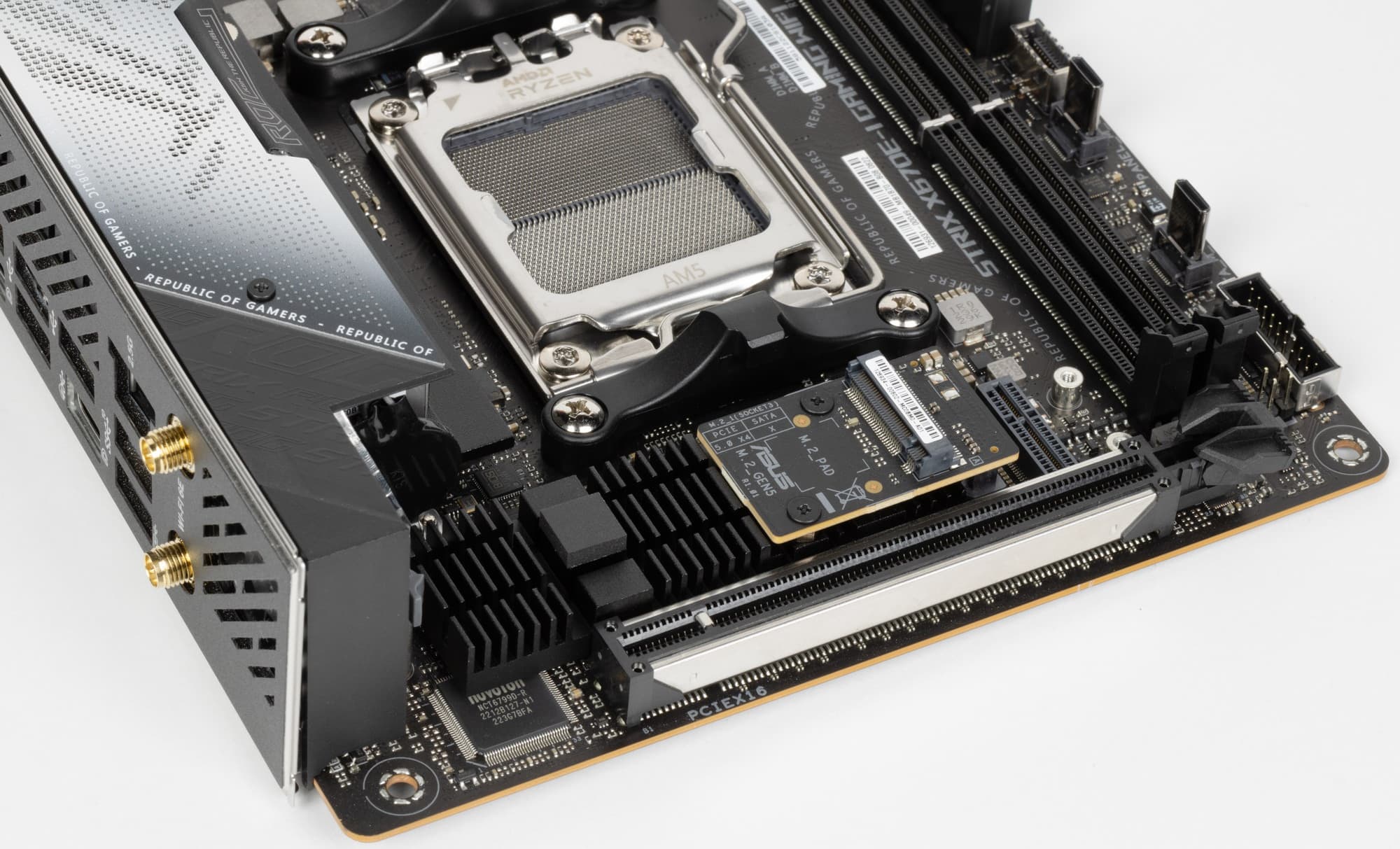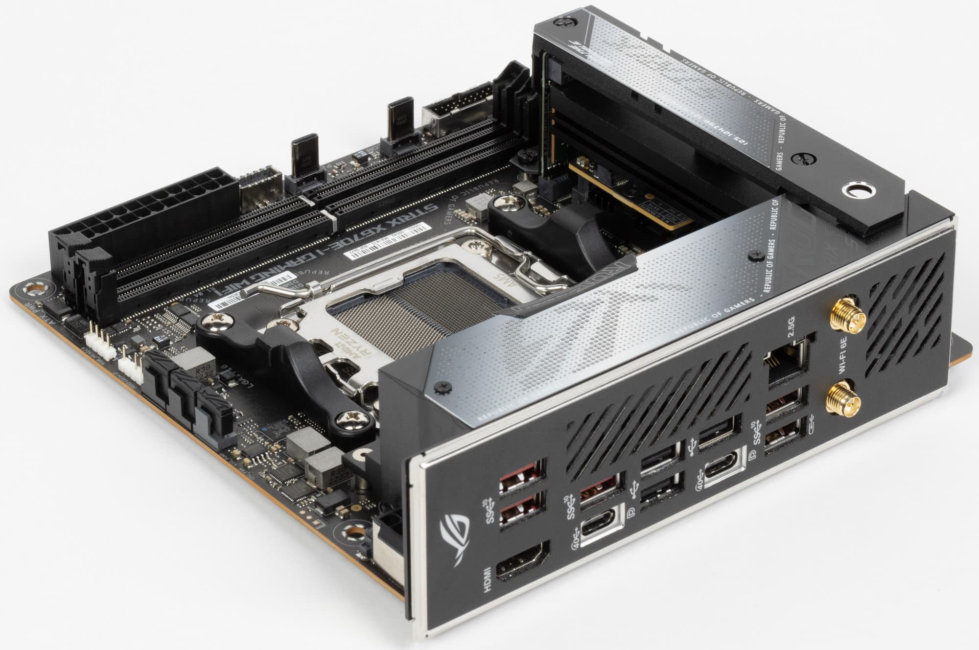Переходим к самой материнской плате Asus ROG Strix X670E-I Gaming WiFi, которая относится к топовому суббренду ROG, поэтому перед нами топовый продукт, однако все же не флагманский (мы помним, что самые-самые в ROG – материнки c суффиксом ROG Crosshair, а не ROG Strix).