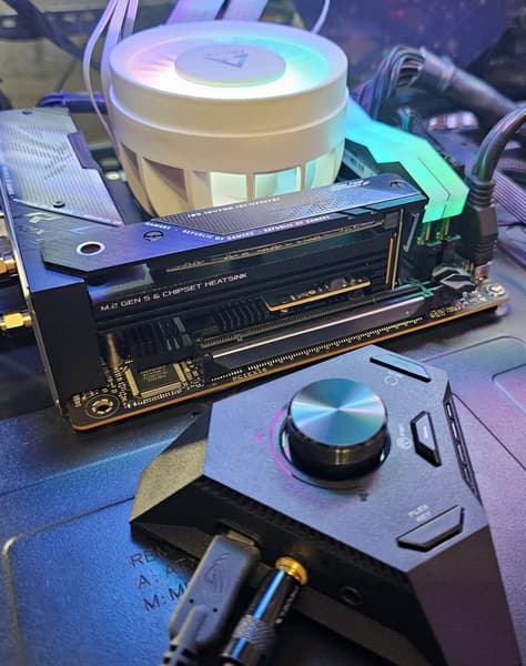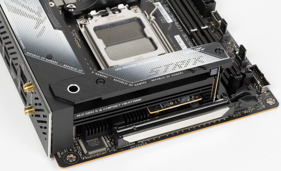 У Asus ROG Strix X670E-I Gaming WiFi имеется 18 портов USB разных видов, включая 7 очень быстрых USB 3.2 Gen2, и 2 порта USB4/Thunderbolt 4 (со скоростью передачи данных до 40 Гбит/с). Плата предлагает 1 слот PCIe х16, который получает от процессора 16 линий PCIe 5.0. Также у нее 2 слота M.2: один из них подключен напрямую к процессору линиями PCIe 5.0, другой подключен к чипсету X670E линиями PCIe 4.0. В арсенале платы также есть 2 порта SATA и 3 разъема для вентиляторов. Система питания процессора весьма мощная, она способна обеспечить работу любых совместимых процессоров с приличным запасом на разгон. Плата имеет грамотную систему охлаждения каждого потенциально греющегося элемента, включая накопители в слотах M.2. Сетевые возможности включают проводной контроллер 2,5 Гбит/с и беспроводной Wi-Fi 6E + Bluetooth 5.3. В числе плюсов платы можно упомянуть возможности для подключения дополнительных RGB-устройств. Отметим и улучшенный аудиокодек Realtek ALC4050.