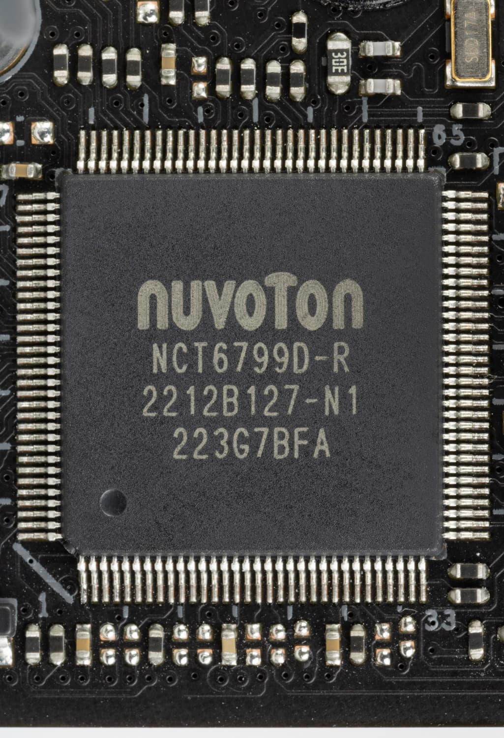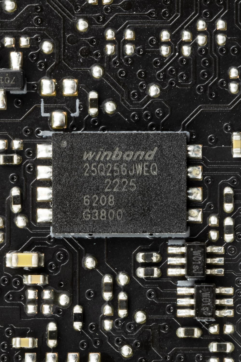 На оборотной стороне расположено несколько контроллеров и традиционная некоторая логика. Текстолит обработан хорошо: во всех точках пайки не только острые концы срезаны, но и все неплохо отшлифовано. В области VRM имеется защитная пластина (бэкплейт), принимающая участие в охлаждении данной области печатной платы.