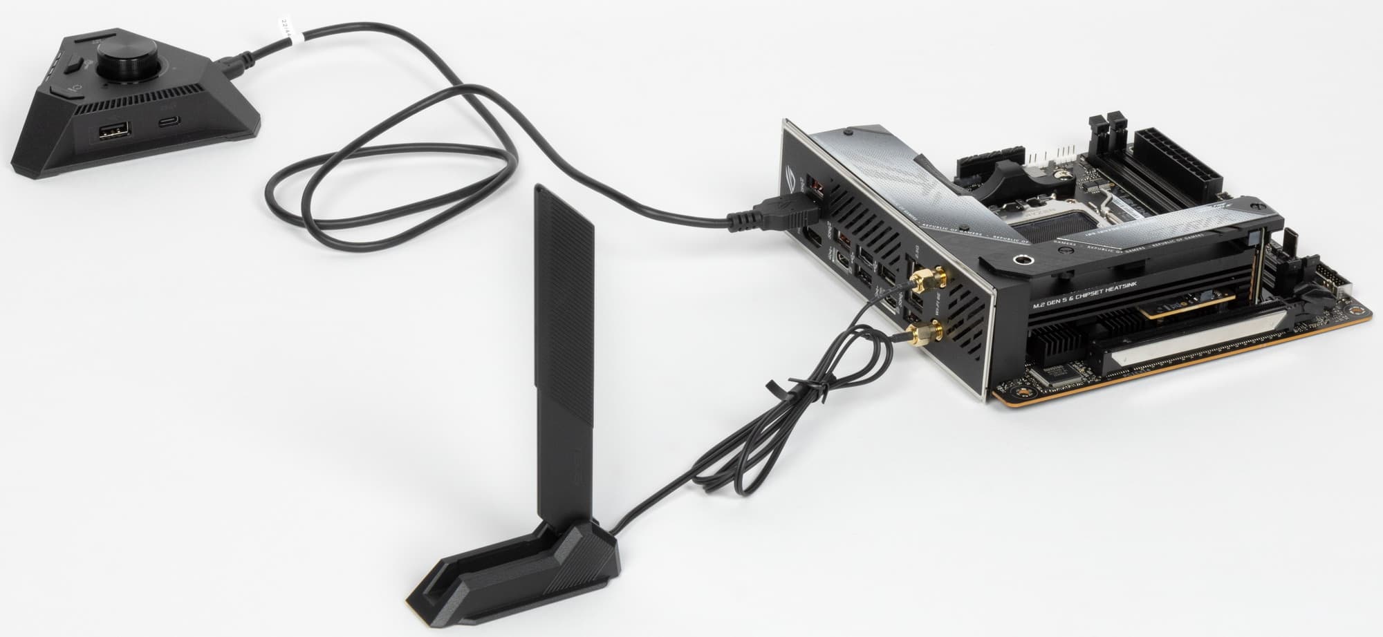 Комплект поставки включает внешний модуль ROG Strix Hive (аудиоразъемы, регулировка громкости, дополнительные интерфейсные порты и пр.) и карту расширения ROG FPS-II (дополнительные интерфейсные порты, возможность подключить провода от передней панели до установки этой карты на плату), которые, собственно, и позволяют такой компактной плате иметь весьма неплохую поддержку периферийных устройств.