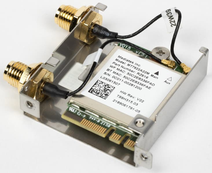Имеется и комплексный беспроводной адаптер на контроллере Mediatek MT7922, через который реализованы Wi-Fi 6E (802.11a/b/g/n/ac/ax) и Bluetooth 5.3. Он установлен в слот M.2 (E-key), и его разъемы для привинчивания выносных антенн выведены на заднюю панель.