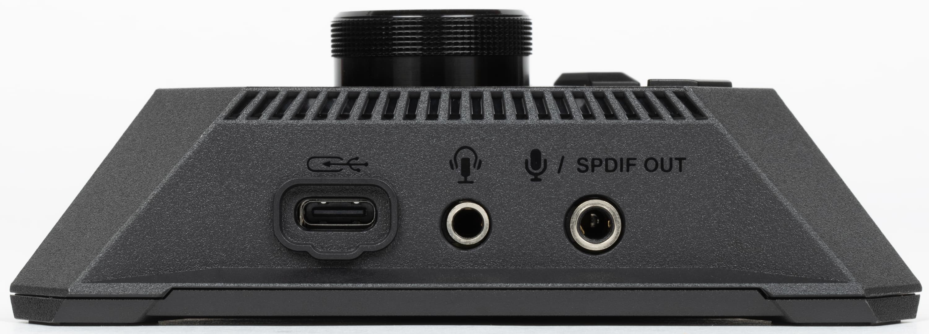 Доступны два интерфейса: выход S/PDIF, совмещенный с микрофонным входом 3.5 мм, а также комбинированный 3.5 мм разъем для наушников (и микрофонов). Управление гнездами осуществляется через ПО.