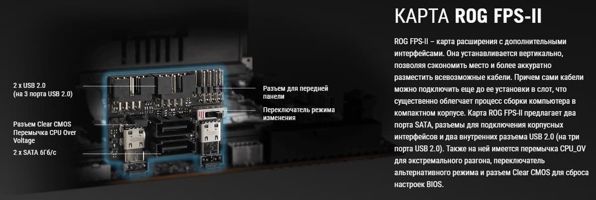 Вспомогательная карта ROG FPS-II (карта расширения) также предназначена для расширения возможностей матплаты в виду ее малых размеров согласно форм-фактора Mini-ITX.