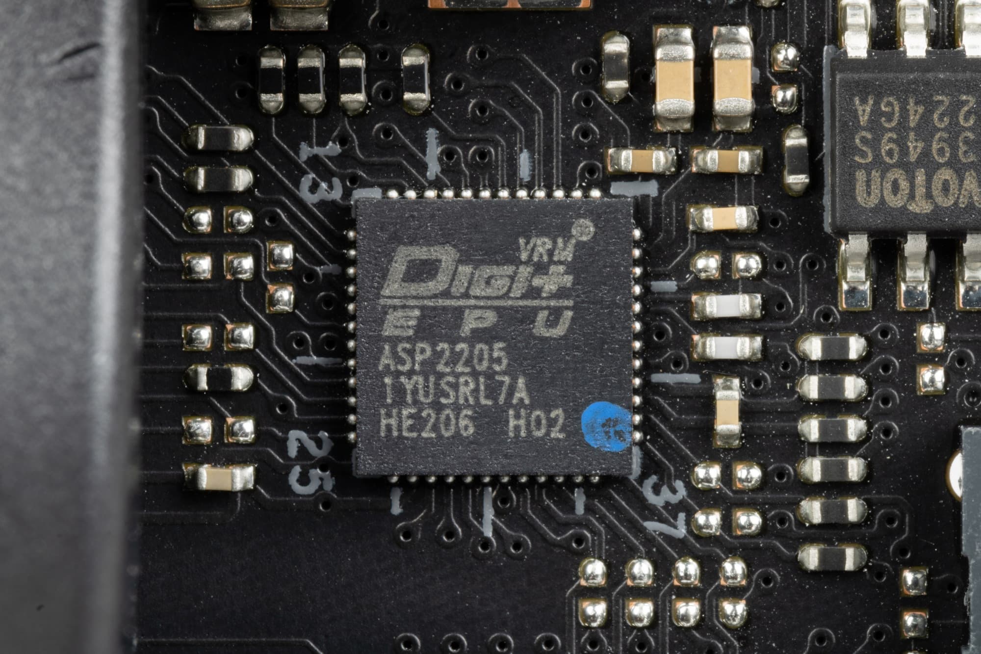 Управляет набором фаз (10+2) фирменный ШИМ-контроллер Digi+ ASP2205.