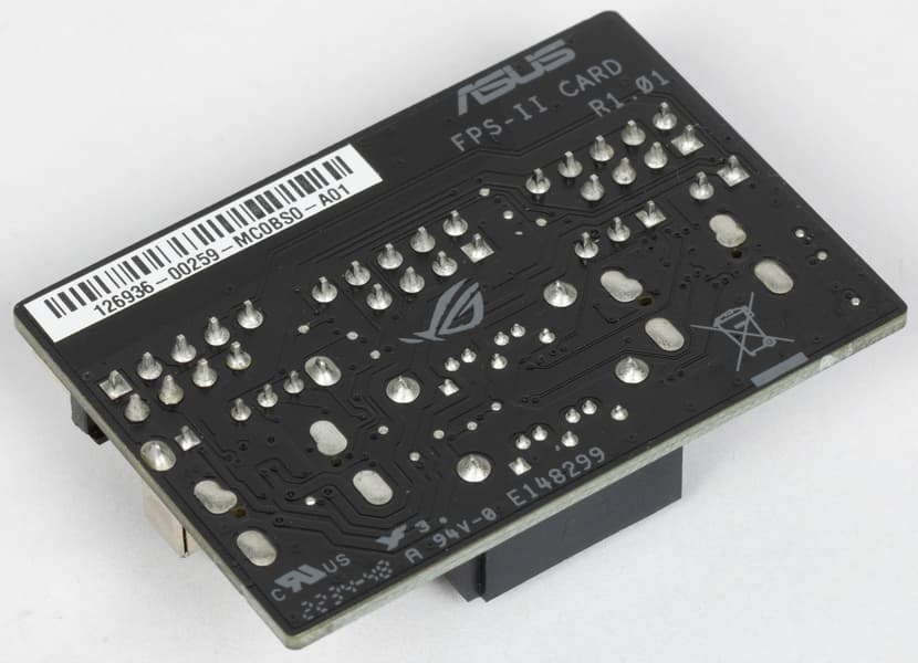| Прочие внутренние элементы на ROG FPS-II | 2 разъема для подключения 3 портов USB 2.0 2 порта SATA 1 переключатель Alt_mode 1 разъем для термодатчика 1 разъем сброса CMOS 1 разъем для подключения управления с передней панели корпуса 1 переключатель CPU_OV |