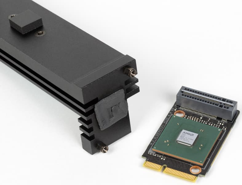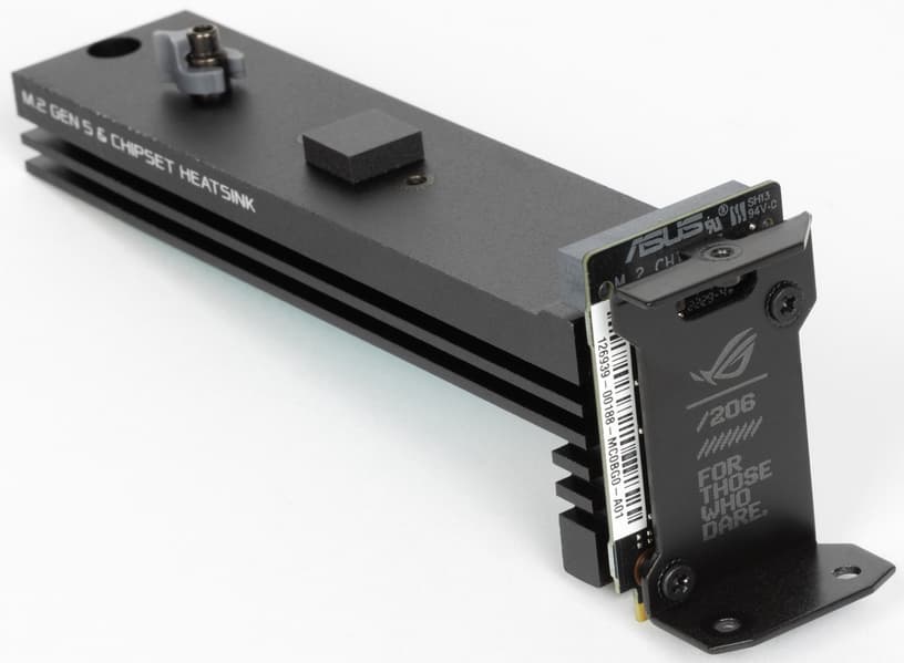 «Этажерка» из слотов M.2 имеет радиаторы для обоих слотов, а также один из них охлаждает чипсет, встроенный в вертикальный переходник.