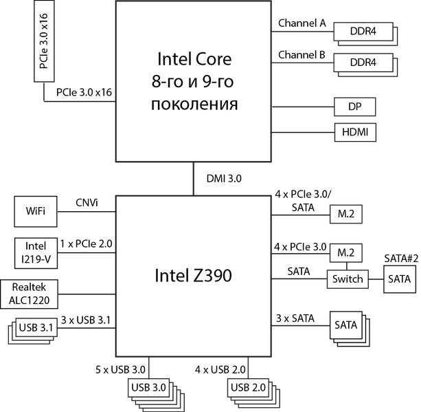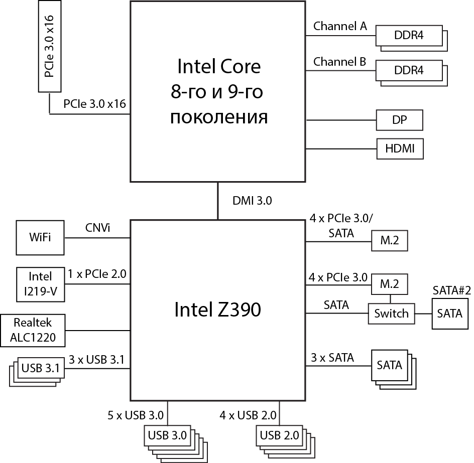 | Поддерживаемые процессоры | Intel Core 8-го и 9-го поколения |