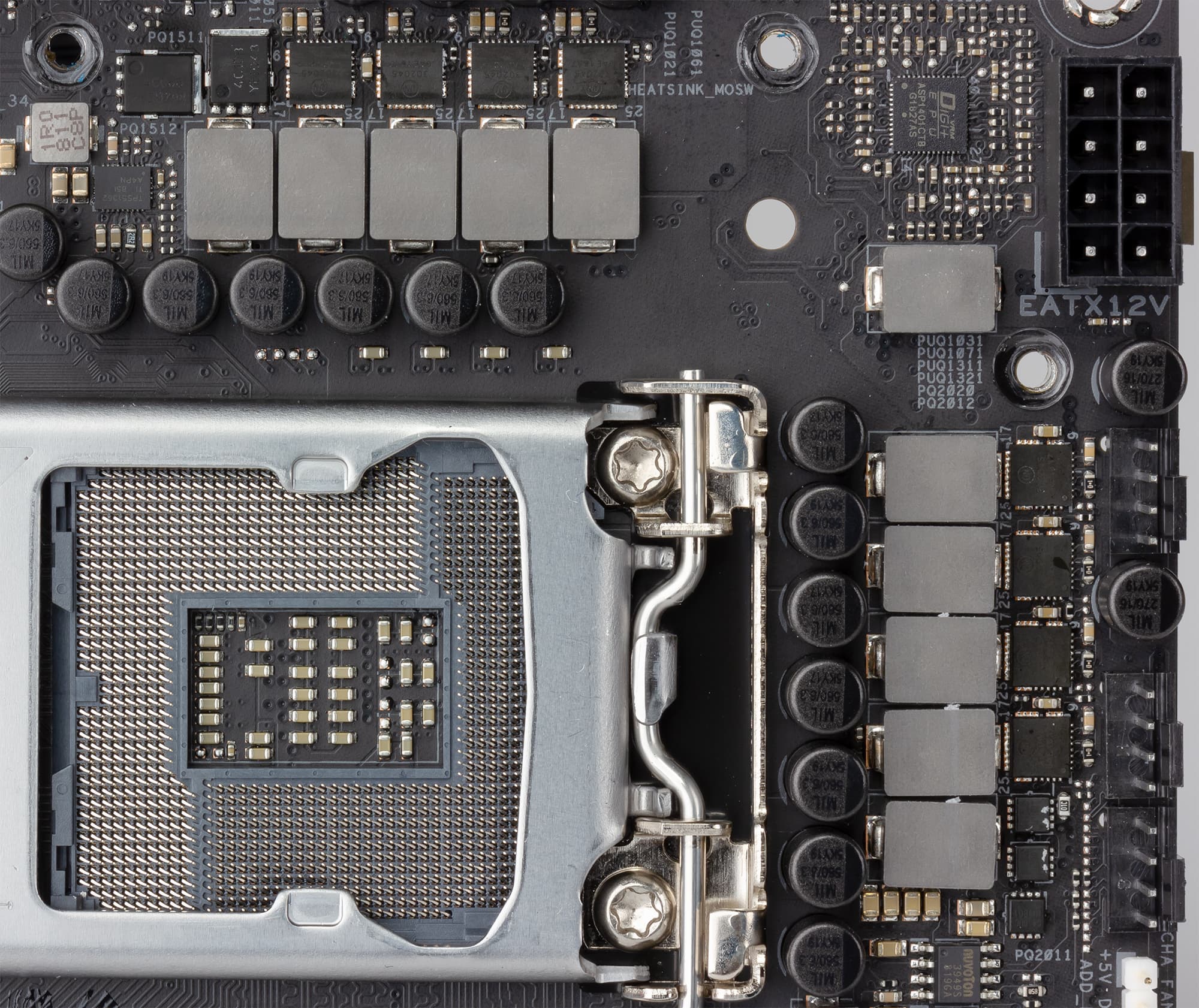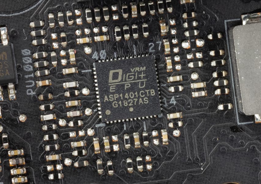 Регулятор напряжения питания процессора на плате является 10-канальным и управляется контроллером с маркировкой ASP1401СTB. В каждом канале питания используется по одному чипу NCP302045 компании On Semiconductor, который объединяет в себе два MOSFET-транзистора (High и Low), а также MOSFET-драйвер.