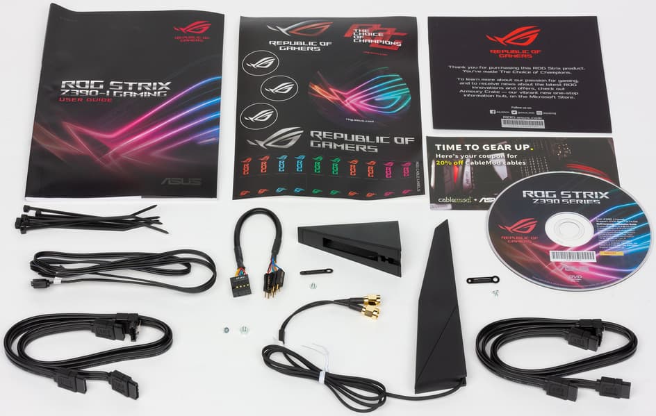 Комплект поставки включает два SATA-кабеля (все разъемы с защелками, один кабель с угловым разъемом с одной стороны), руководство пользователя, DVD-диск с программным обеспечением и драйверами, антенну для встроенного Wi-Fi-модуля, кабель для подключения светодиодной ленты и, конечно же, различные стикеры.