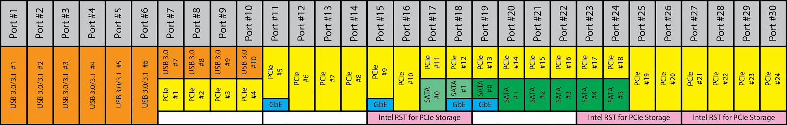 Чтобы понять, почему необходимо указанное выше разделение портов, давайте обратимся к схеме распределения HSIO-портов чипсета Intel Z390.