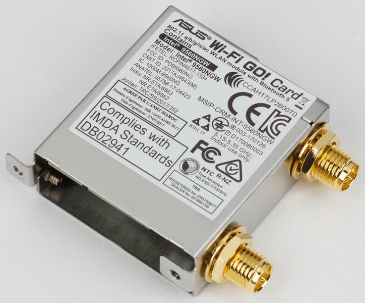 Кроме того, в отдельный (третий) разъем M.2 на плате установлен Wi-Fi-контроллер Intel Wireless-AC 9560, который использует чипсетный интерфейс CNVi. Напомним, что интерфейс CNVi (Connectivity Integration) обеспечивает работу соединений Wi-Fi (802.11ac, до 1733 Мбит/с) и Bluetooth 5.0. Однако контроллер CNVi — это не полноценный сетевой контроллер, а MAC-контроллер. Для полноценного контроллера нужна еще карта (например, Intel Wireless-AC 9560, как в данном случае) с разъемом M.2 (ключ E-типа), которая поддерживает интерфейс CNVi.