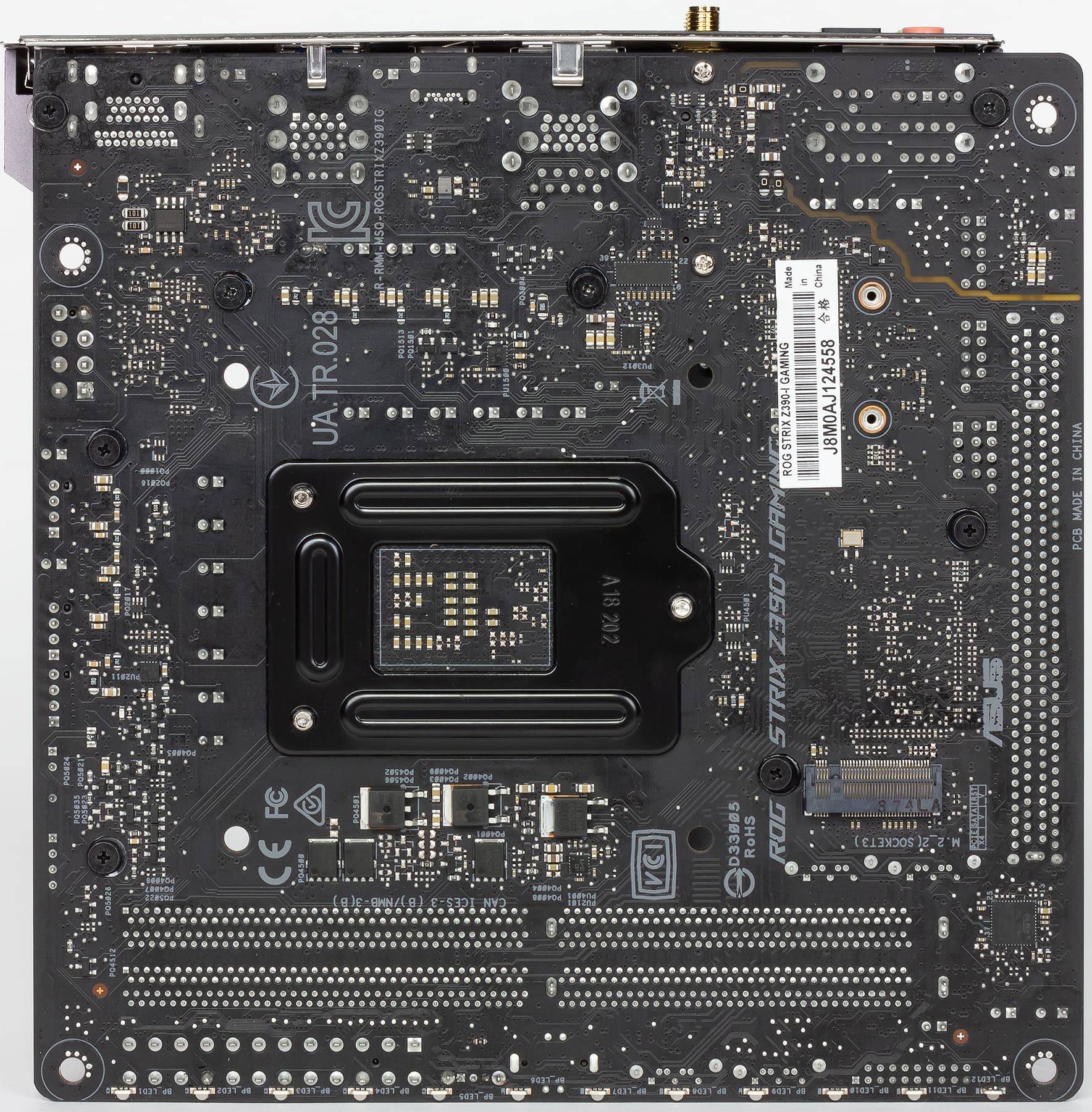 Поскольку на плате с размерами 17×17 см места очень мало, один из разъемов M.2 расположен с обратной стороны платы. Это опять-таки стандартное решение, на платах с форм-фактором Mini-ITX второй разъем M.2 всегда располагается с обратной стороны платы.