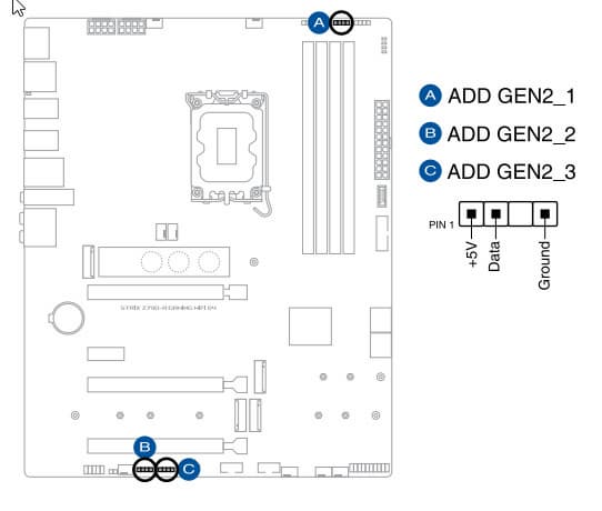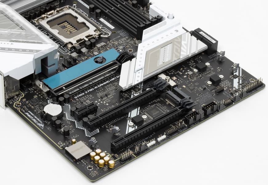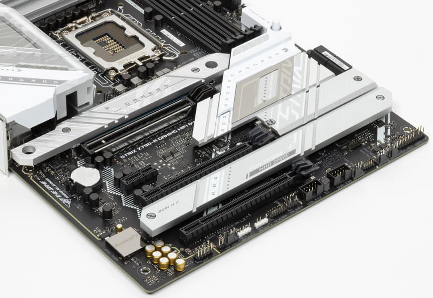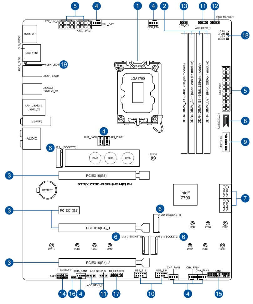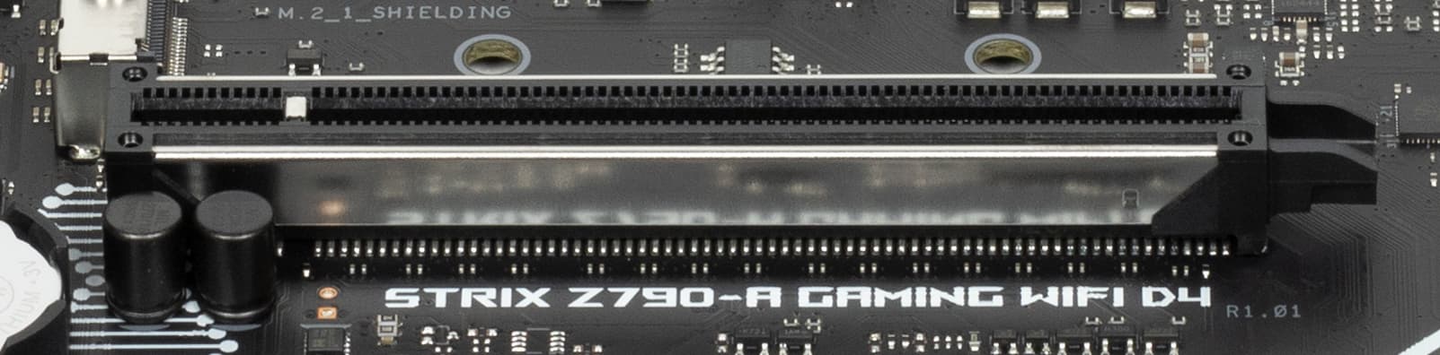 Второй, третий и четвертый слоты M.2 (M2_2, M2_3, М2_4) получают данные от чипсета Z790, а первый — от CPU (PCIe 4.0). При этом только М2_4 (PCIe 4.0) поддерживает модули с любым интерфейсом, а все остальные работают с модулями только с PCIe интерфейсом.